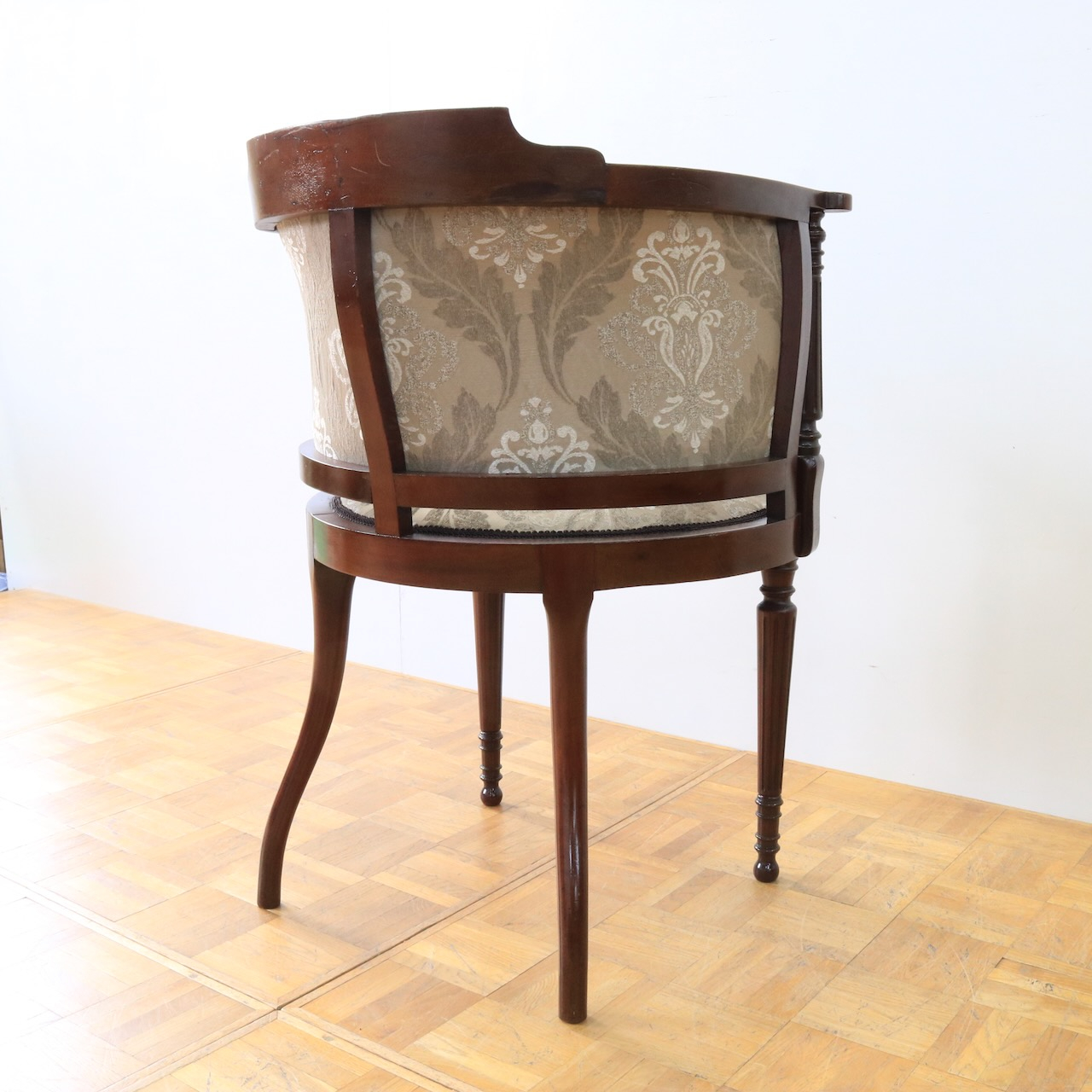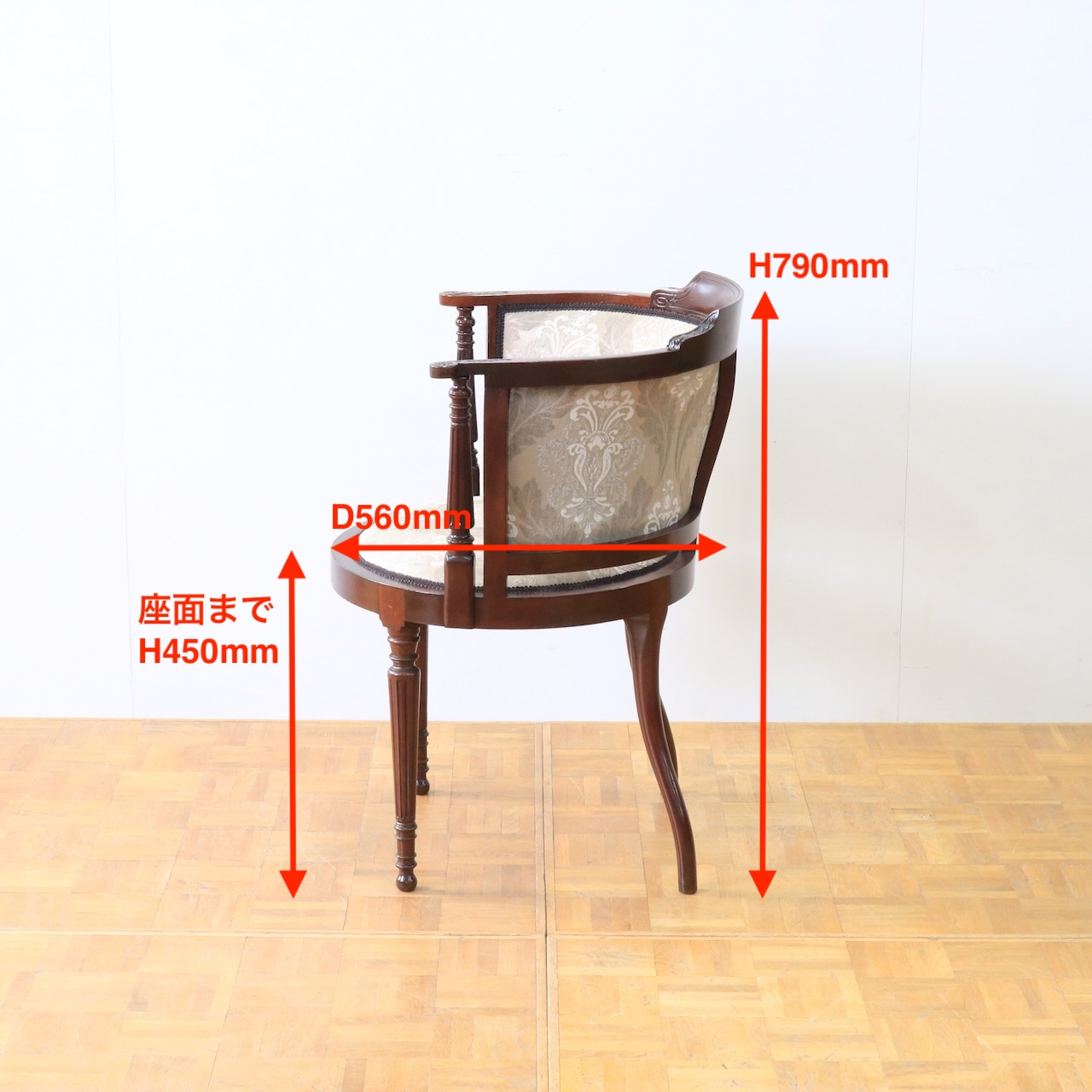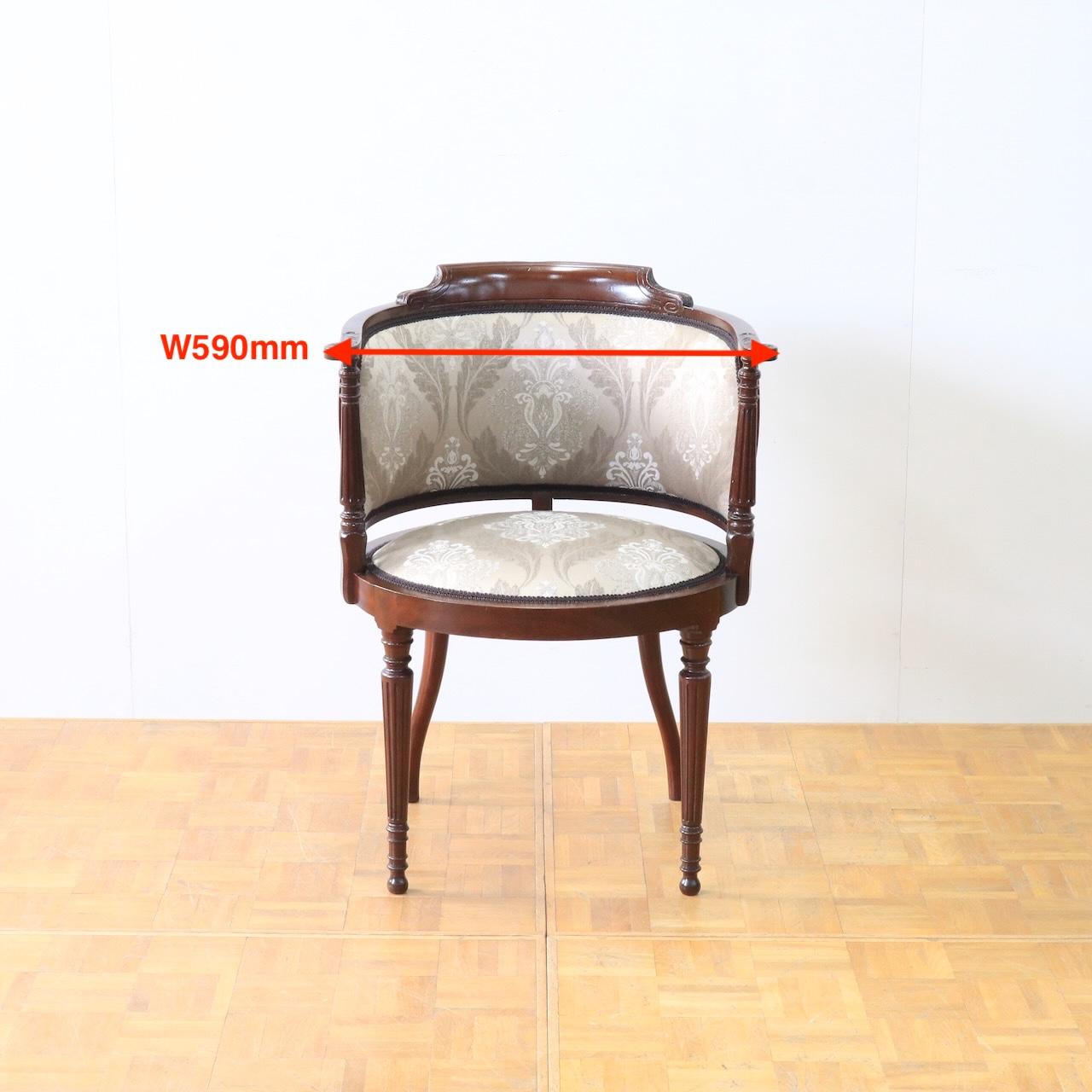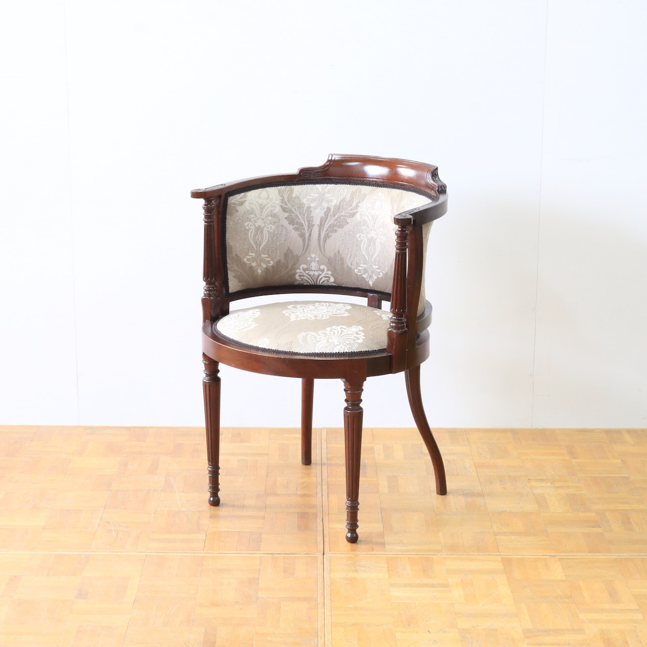 配送料の目安 ▶︎1900年代、マホガニー材のタブチェアー。全体に装飾は抑え気味ですが、アーム部分の彫刻や脚の挽物加工によるちょっとした飾りがよいアクセントになっています。タブ=風呂桶のように身体をすっぽりと包むデザインです。