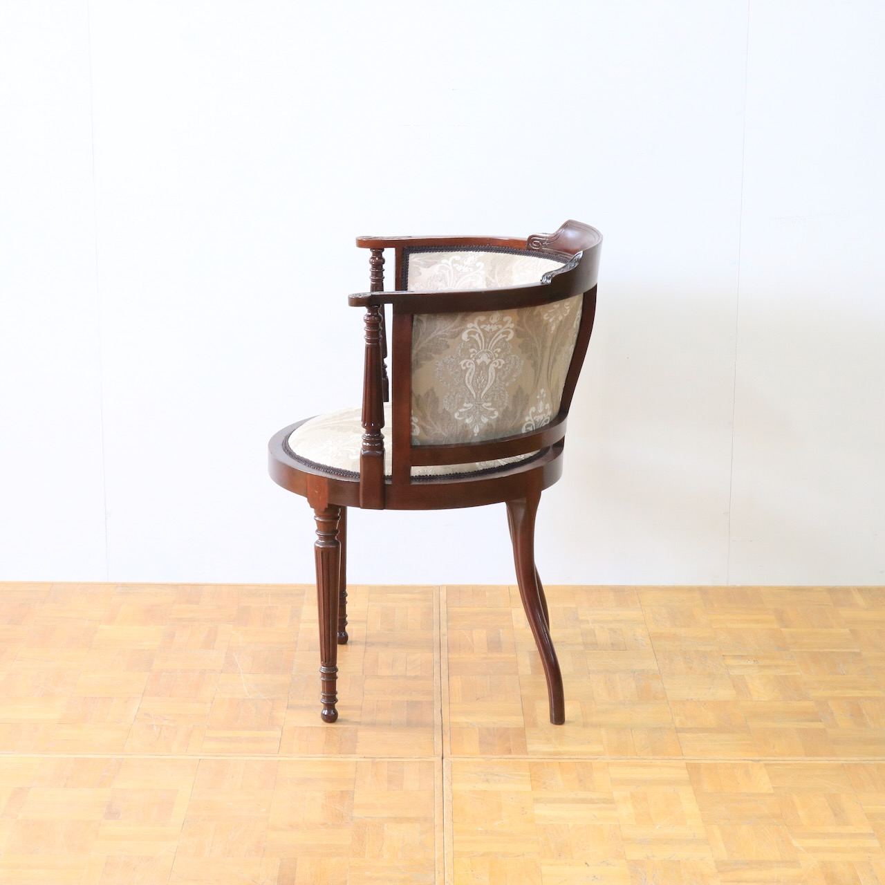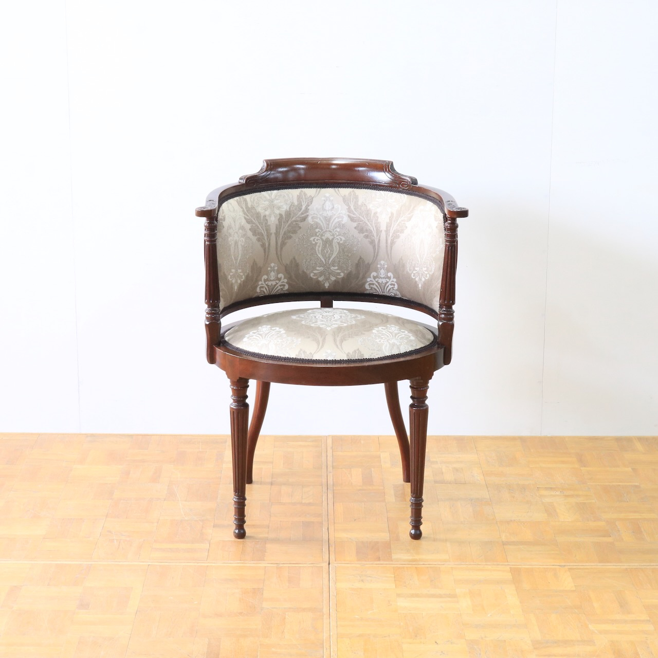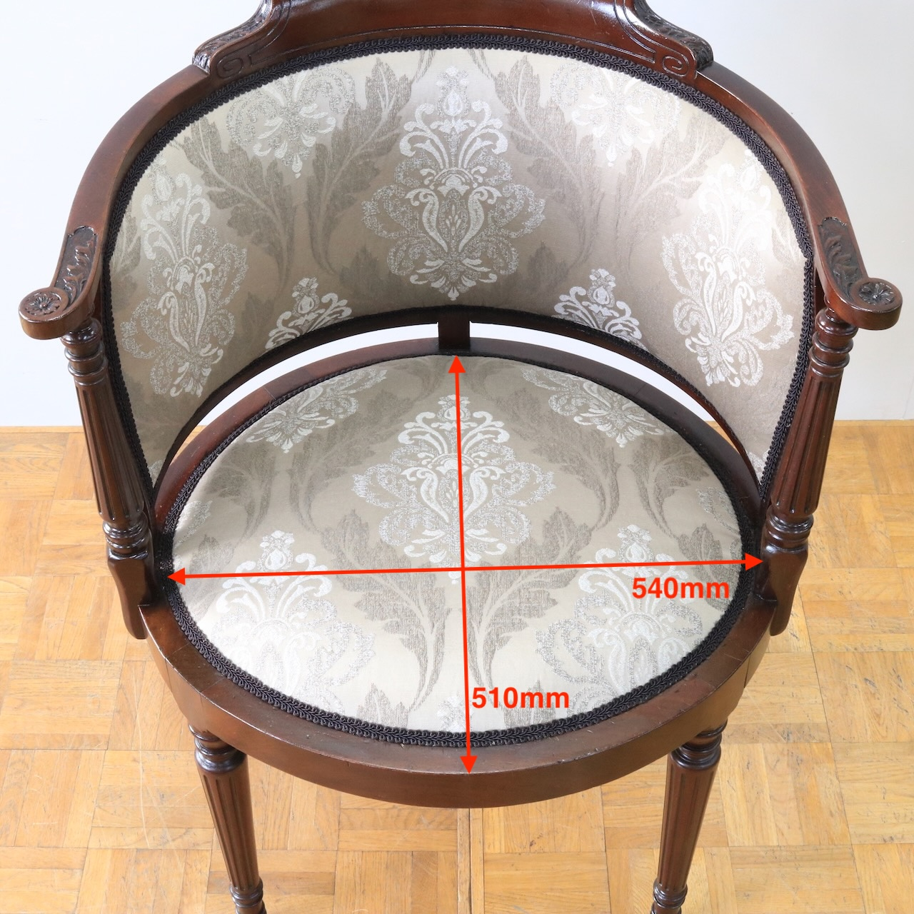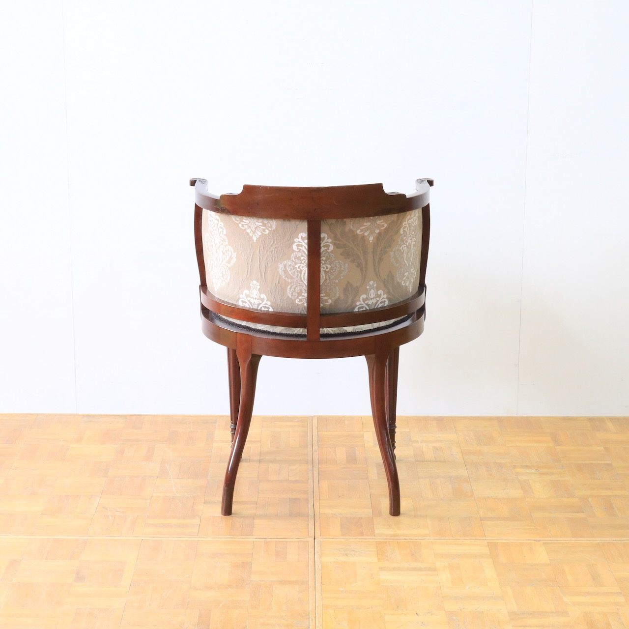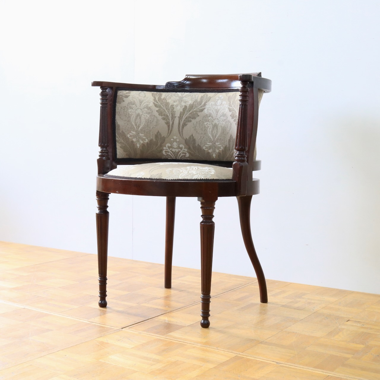 配送料の目安 ▶︎1900年代、マホガニー材のタブチェアー。全体に装飾は抑え気味ですが、アーム部分の彫刻や脚の挽物加工によるちょっとした飾りがよいアクセントになっています。タブ=風呂桶のように身体をすっぽりと包むデザインです。