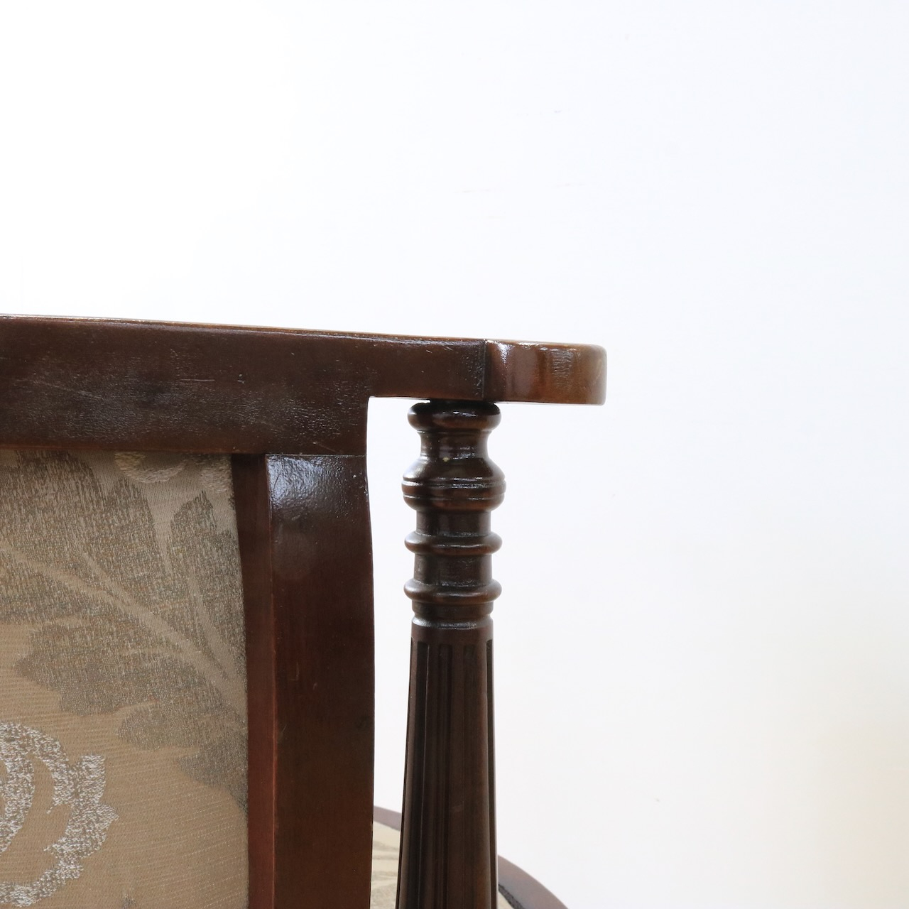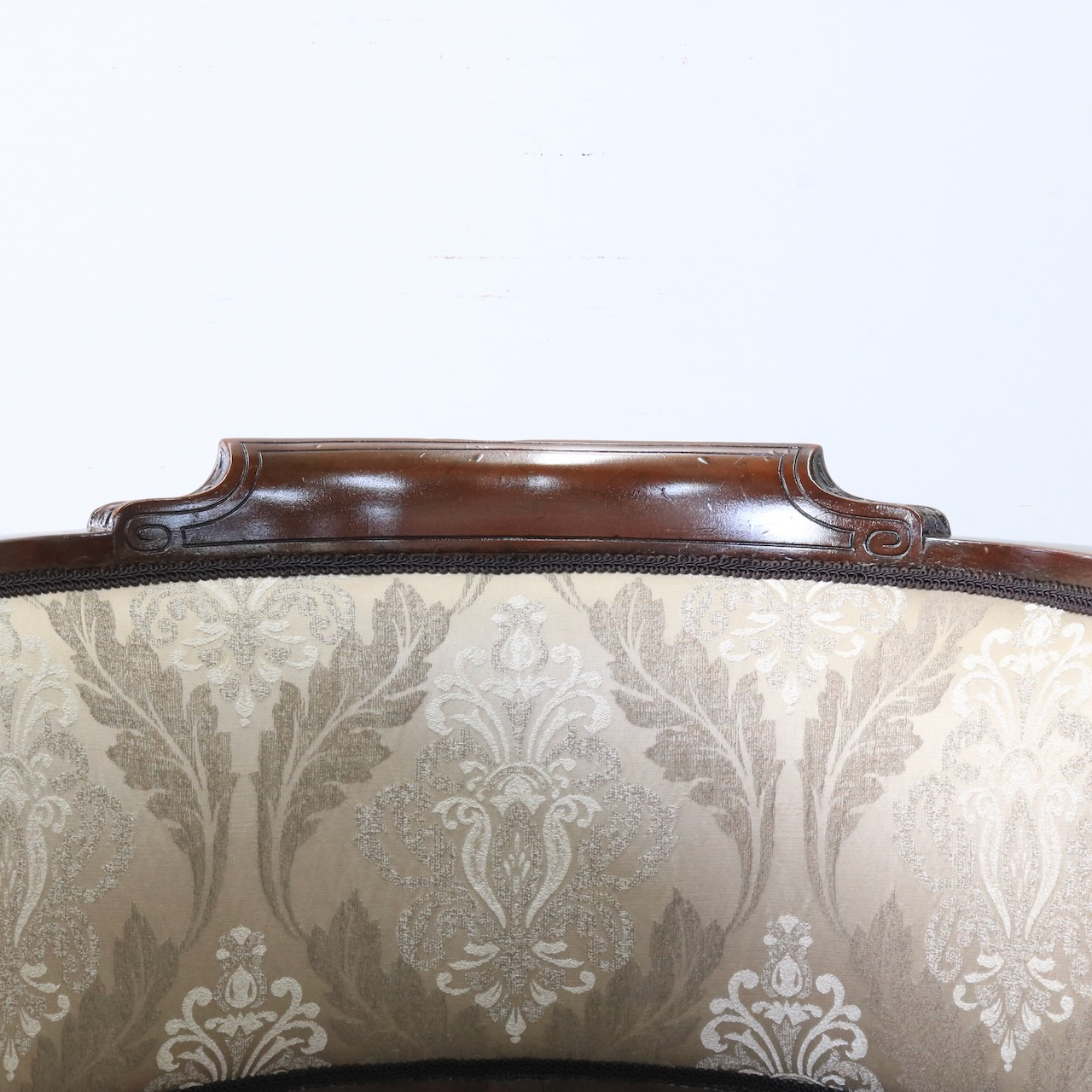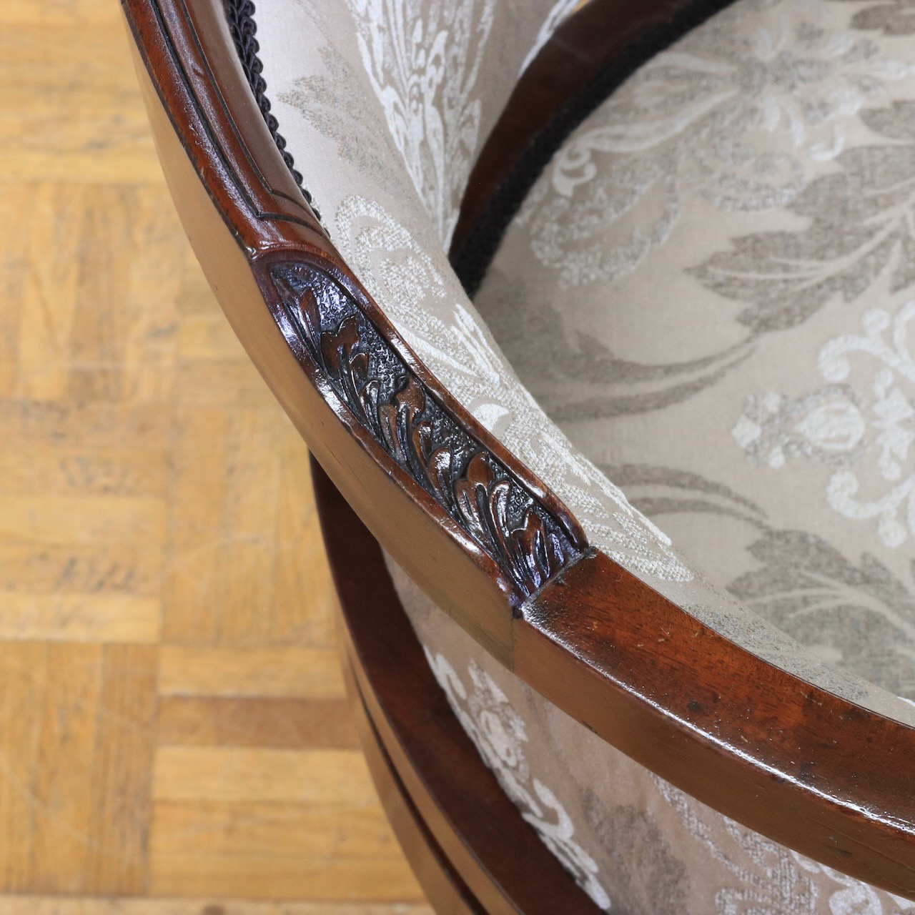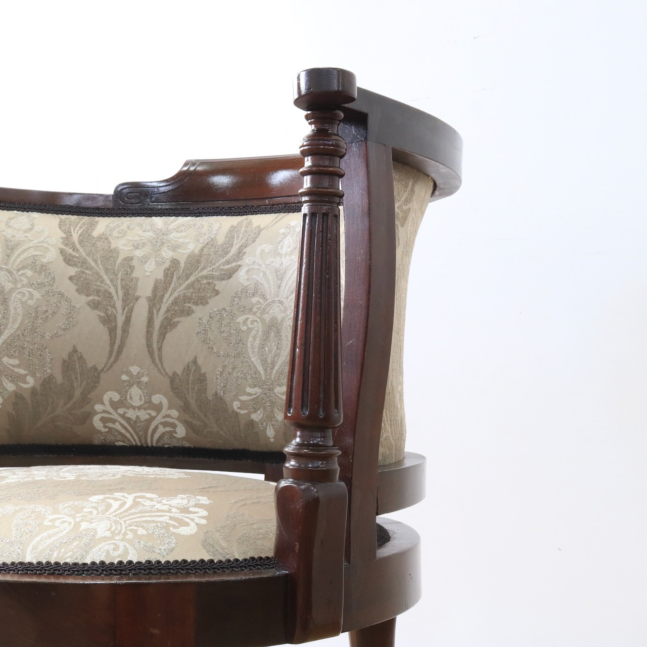 配送料の目安 ▶︎1900年代、マホガニー材のタブチェアー。全体に装飾は抑え気味ですが、アーム部分の彫刻や脚の挽物加工によるちょっとした飾りがよいアクセントになっています。タブ=風呂桶のように身体をすっぽりと包むデザインです。
