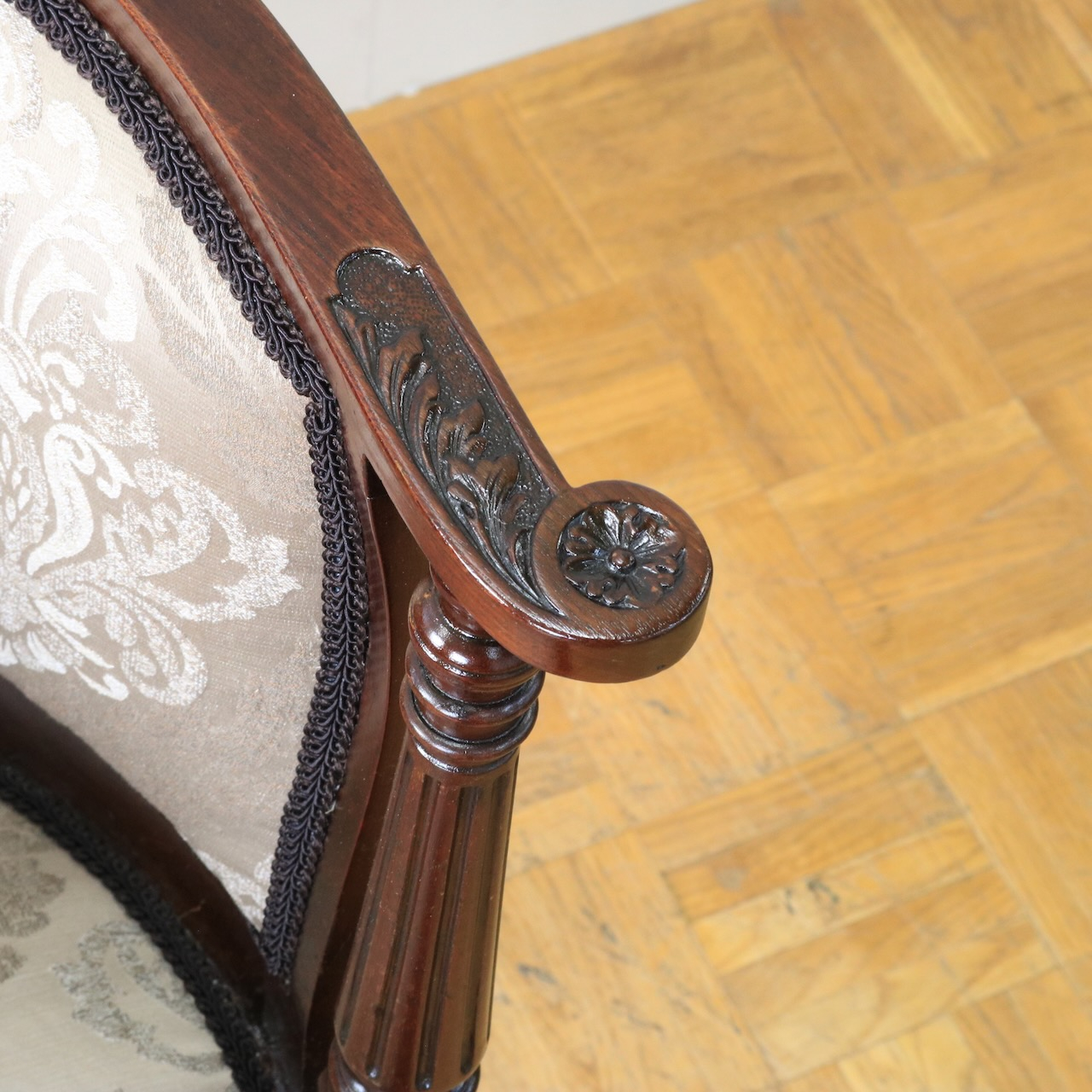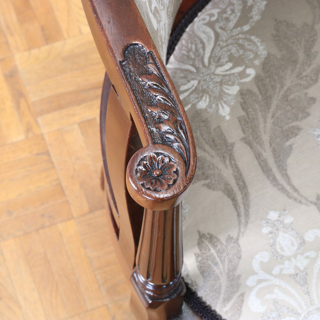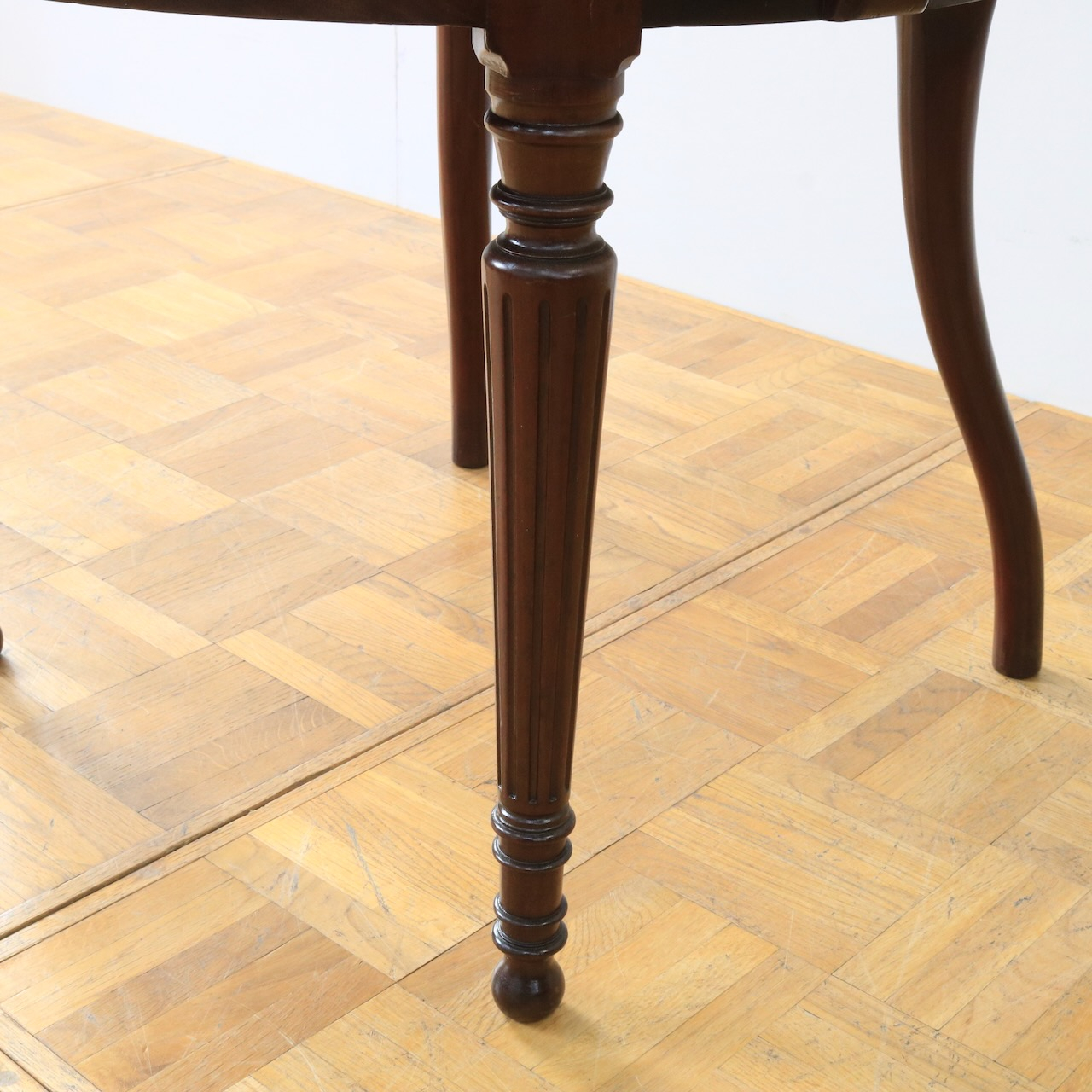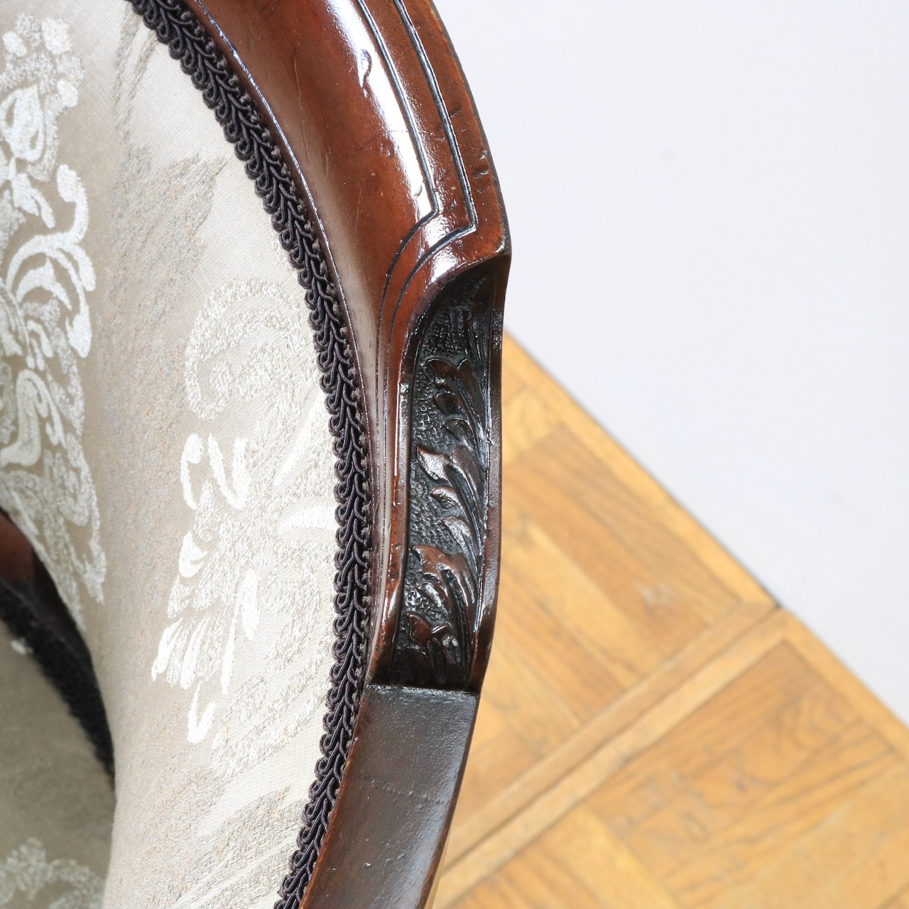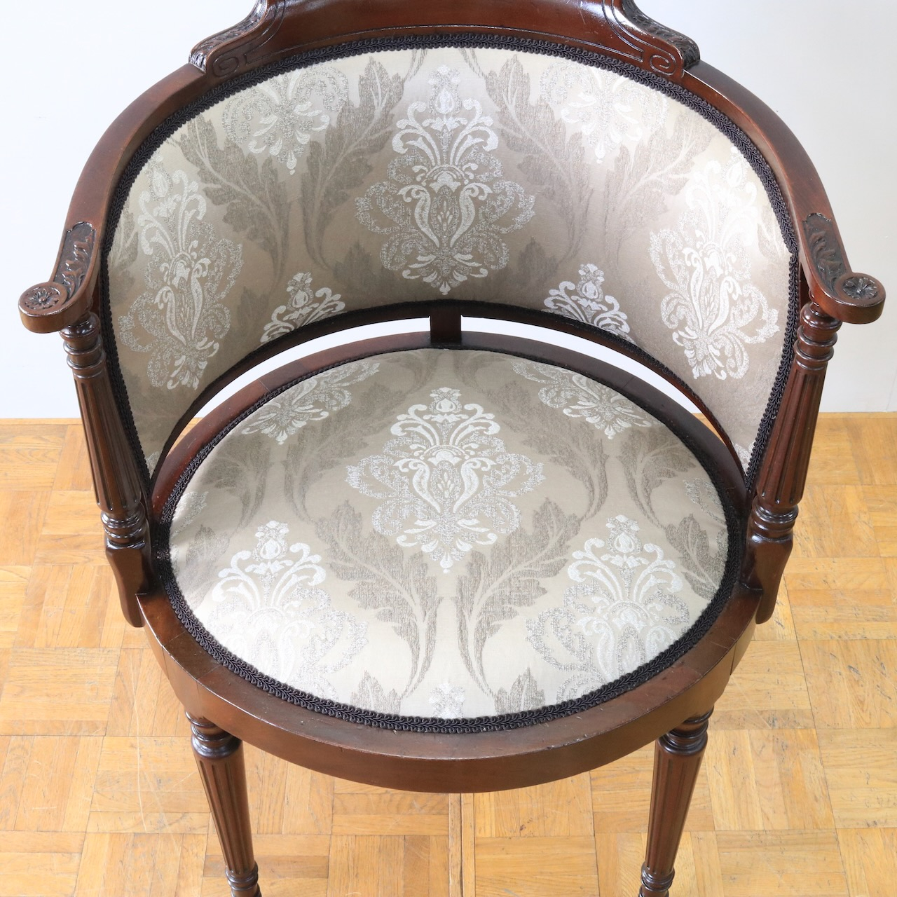 配送料の目安 ▶︎1900年代、マホガニー材のタブチェアー。全体に装飾は抑え気味ですが、アーム部分の彫刻や脚の挽物加工によるちょっとした飾りがよいアクセントになっています。タブ=風呂桶のように身体をすっぽりと包むデザインです。