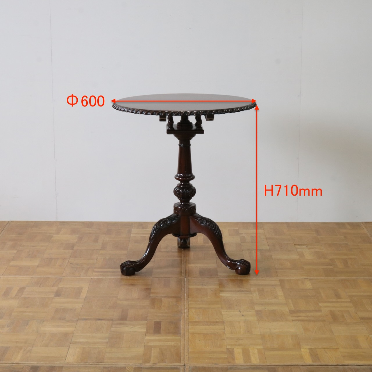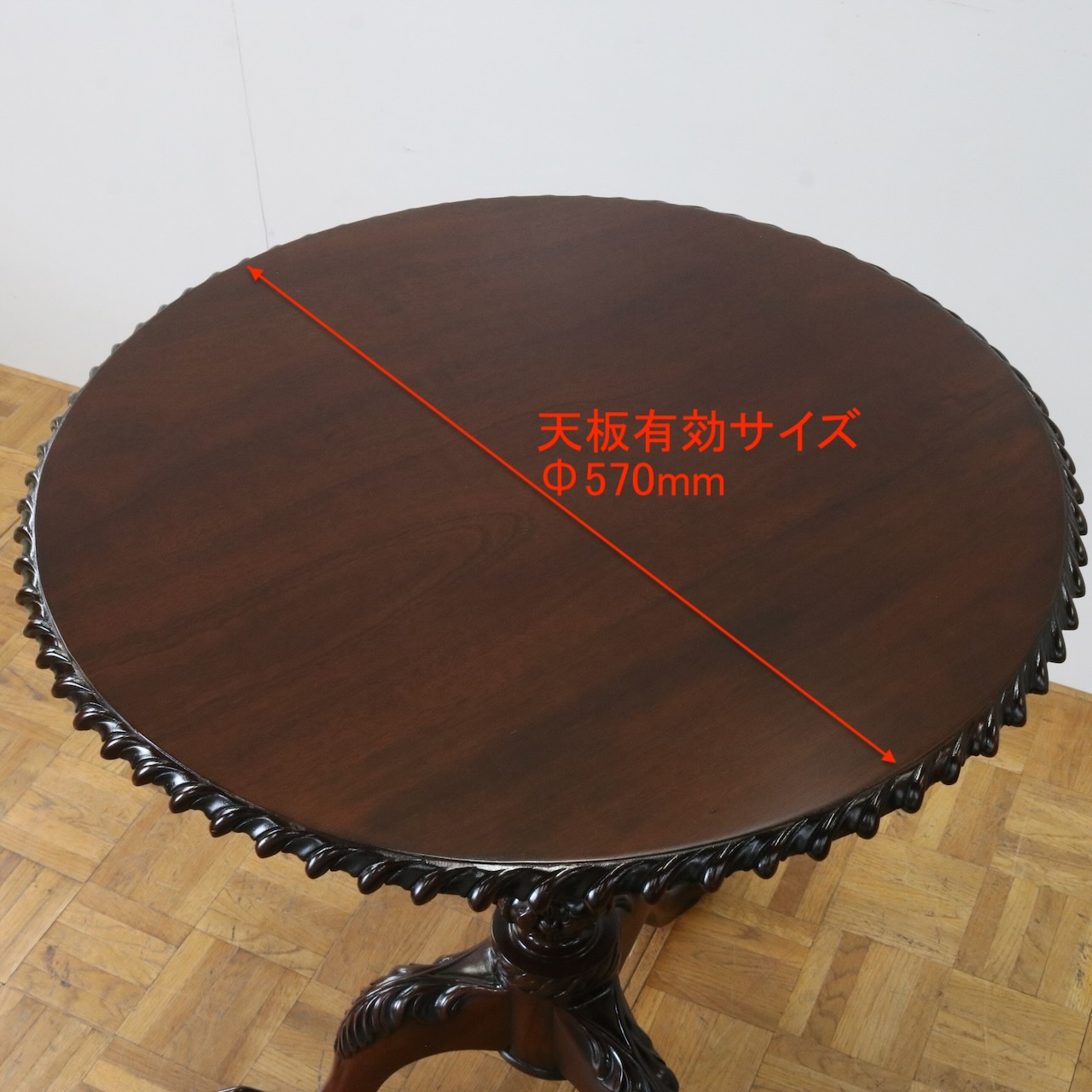 天板縁の装飾や脚元のアカンサスの葉の意匠など、アンティークらしいデザインも楽しめます。
