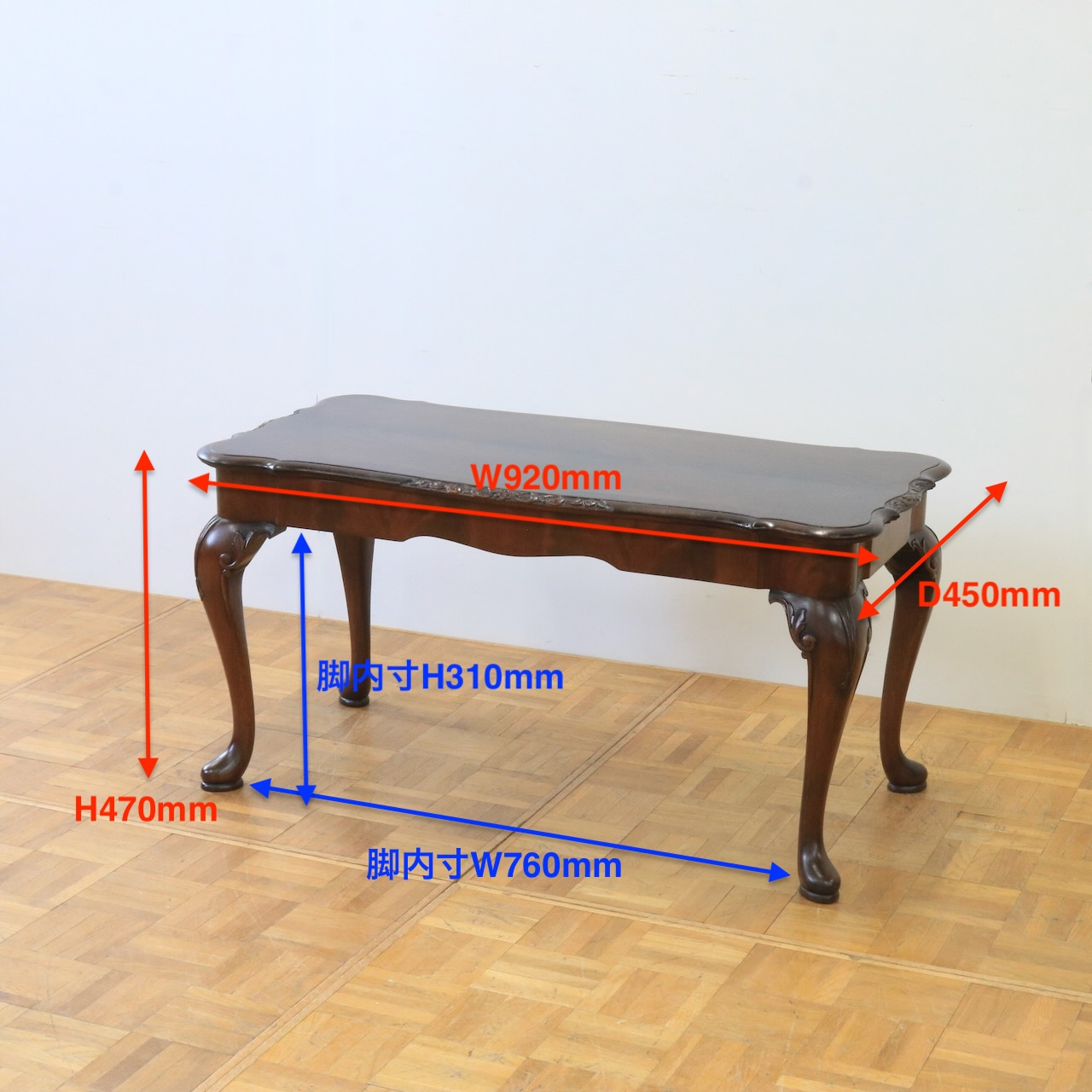 天板にはマホガニー特有の艶やかな木目が美しく現れ、脚部の曲線的なデザインが上品な印象を与えます。