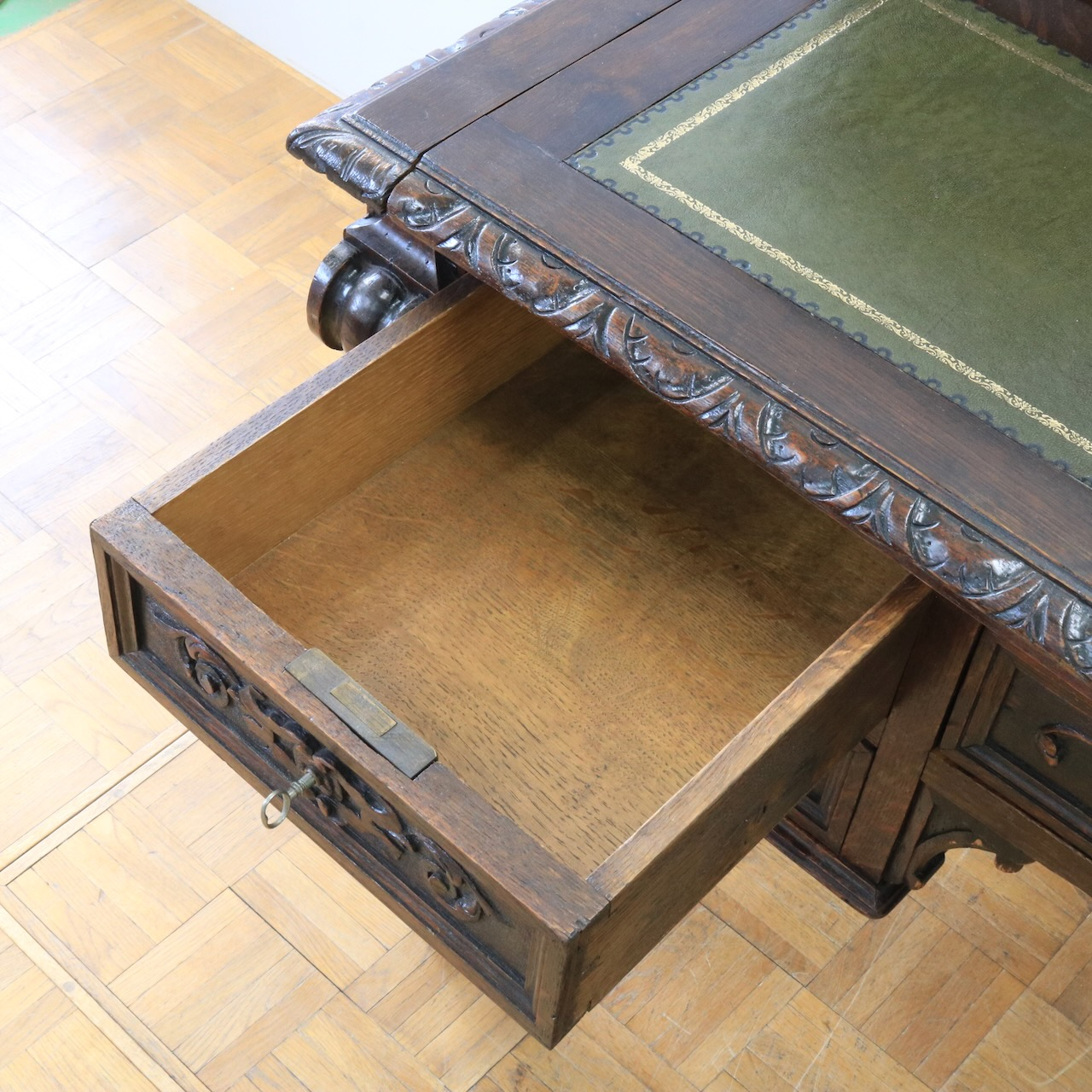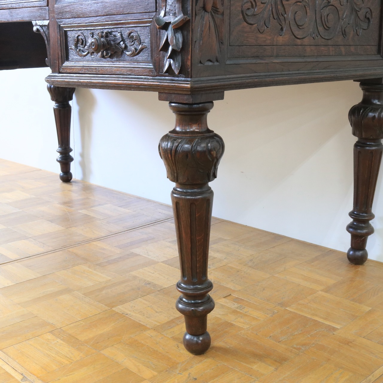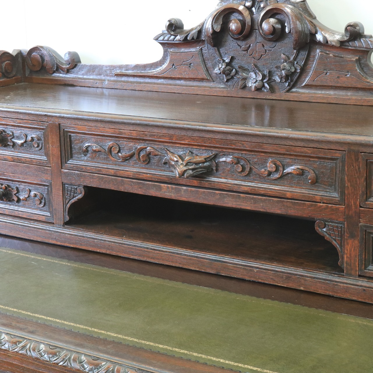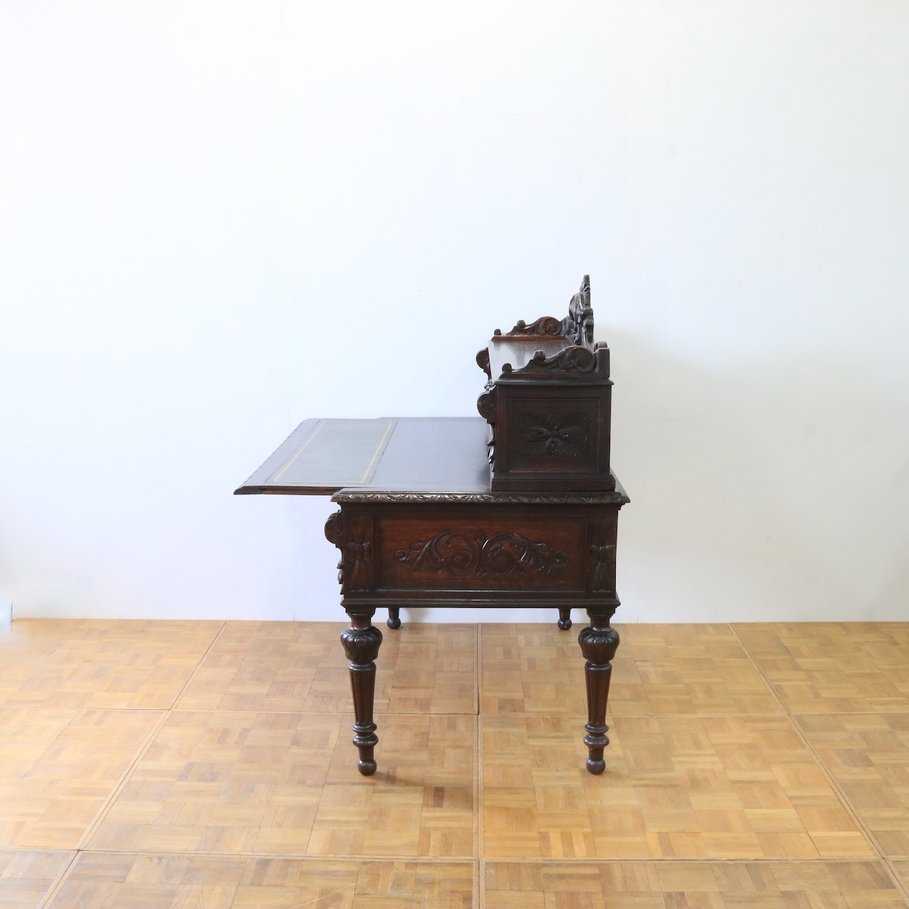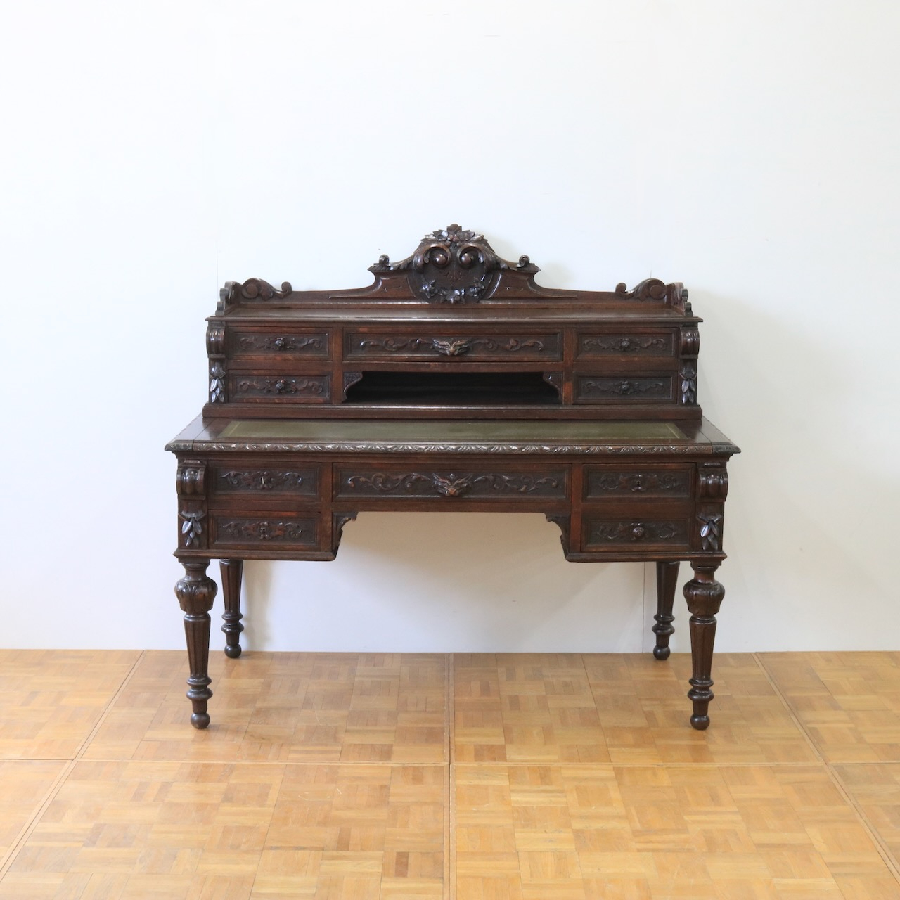 トップから脚先に至るまでレリーフが施された英国アンティークならではの重厚な佇まいのひと品。中央引き出しの引き手がライオンのモチーフになっています。重厚なレリーフは天板縁やサイドにも施され、横から見た時の姿も美しくデザインされており、クオリティの高いライティングデスクです。
