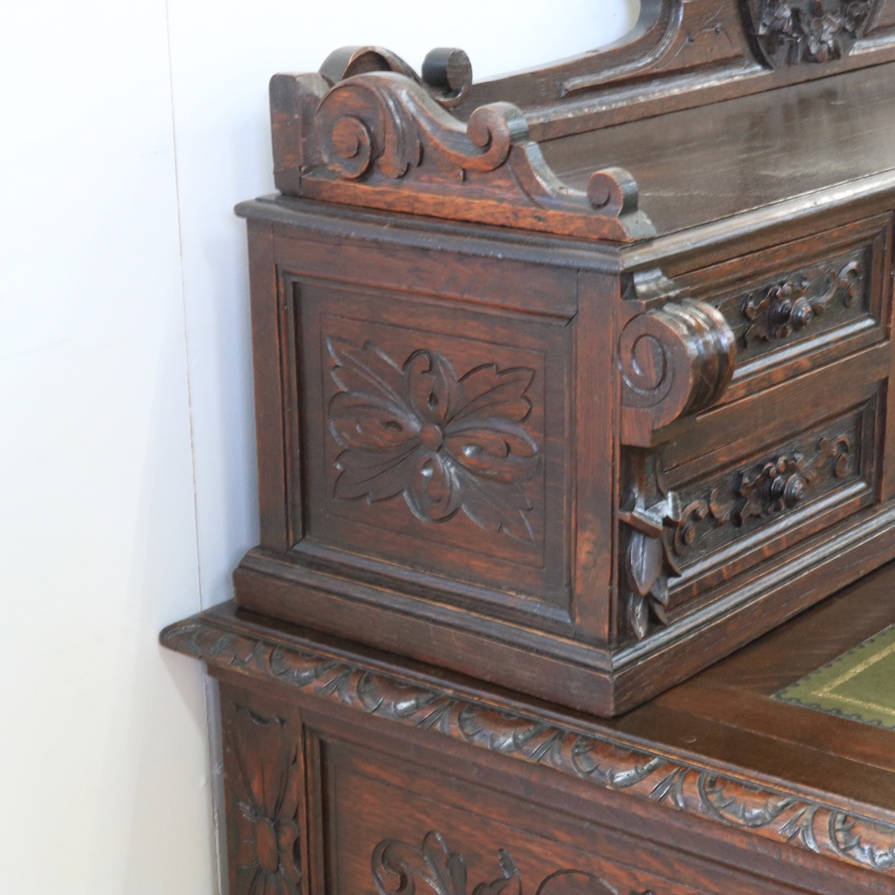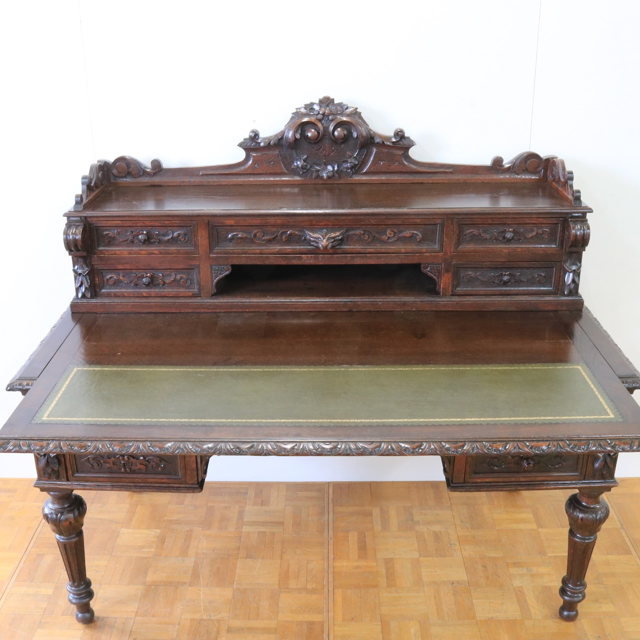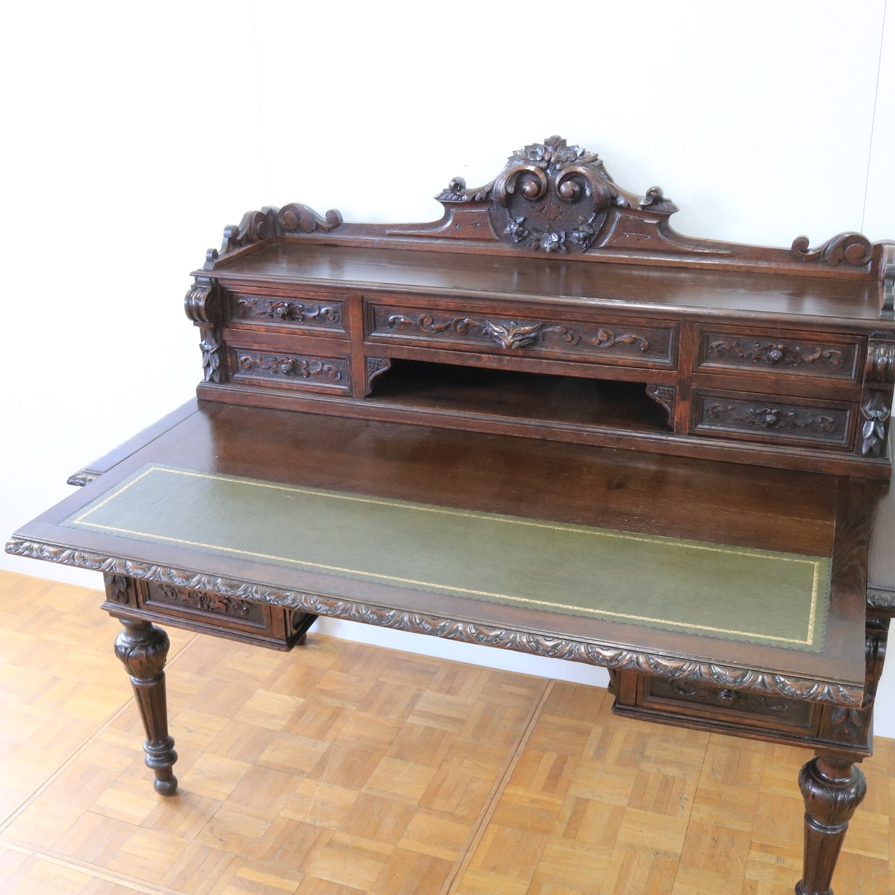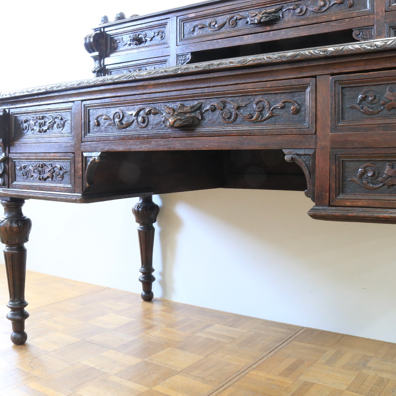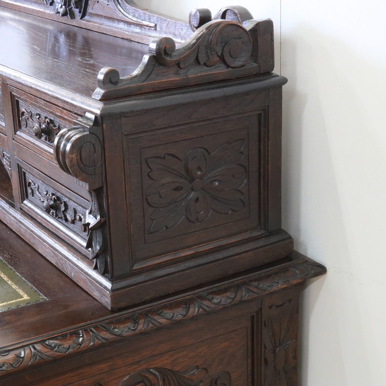 トップから脚先に至るまでレリーフが施された英国アンティークならではの重厚な佇まいのひと品。中央引き出しの引き手がライオンのモチーフになっています。重厚なレリーフは天板縁やサイドにも施され、横から見た時の姿も美しくデザインされており、クオリティの高いライティングデスクです。