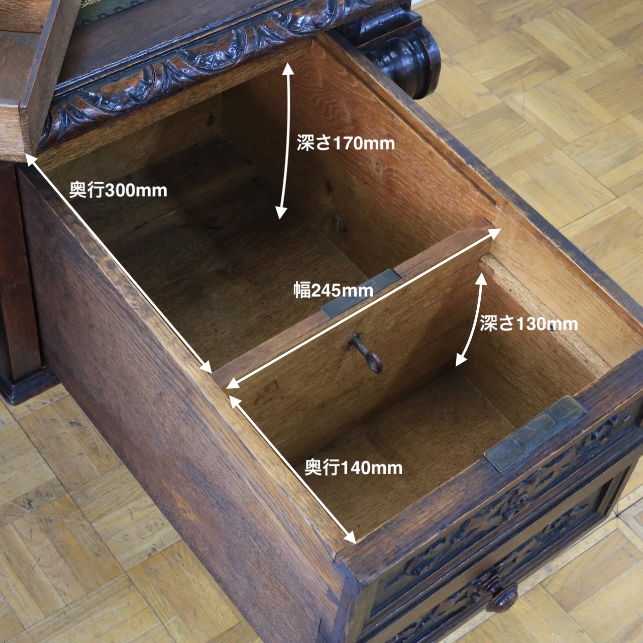 鍵を開けると、奥の部分の蓋をスライドして開けることができ、深さのある収納部分が現れます。凝ったギミックの奥に、かつては一体何を隠していたのかしら…なんて想像するのもアンティーク家具の楽しみ方の一つです。