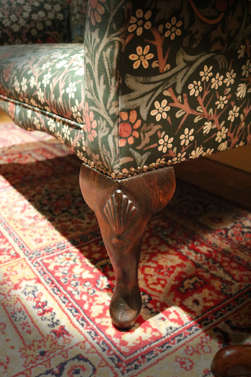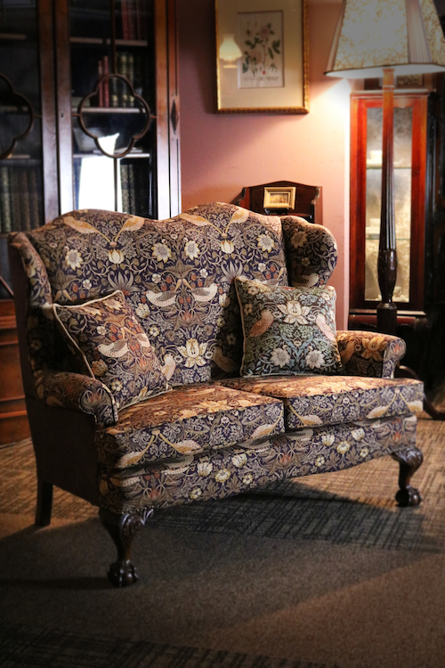 ハイバックの二人掛けソファは、お部屋で一際目を引く存在感を放ちます。広めの表面に愛らしい小鳥たちを描いた人気の柄が際立つ様、外側両サイドと背面はベースが同系色の紫の無地生地で張りました。クラシックなスタイルのフォルムに包まれ、お気に入りの柄と共に居心地の良い時間を過ごしてみてはいかがでしょうか。脚元のアカンサスの彫刻はファブリックの草花の柄にも馴染み、ウォールナット の上質な風合いも魅力的です。