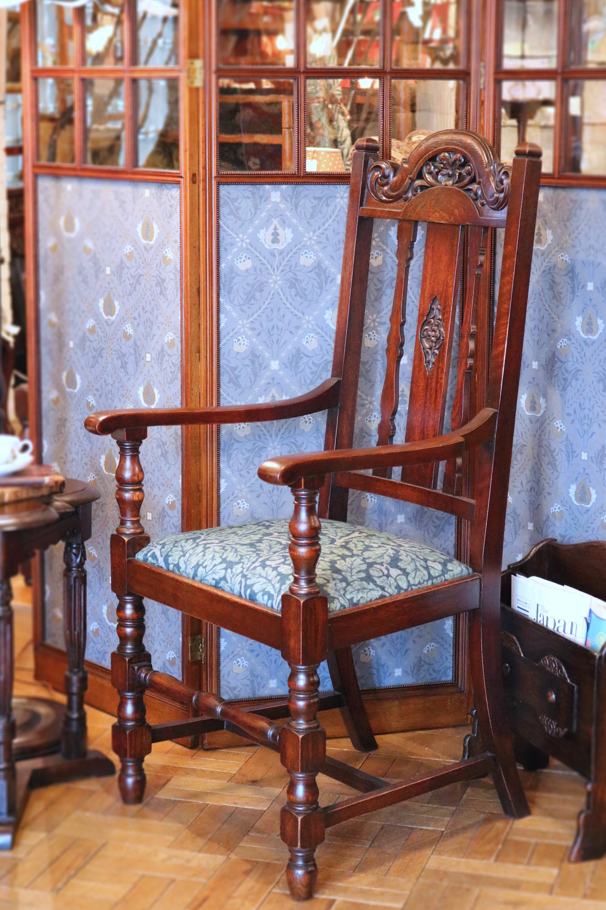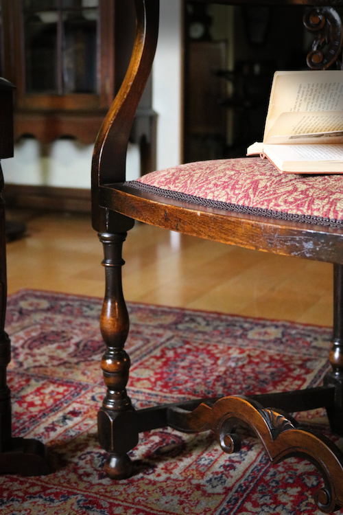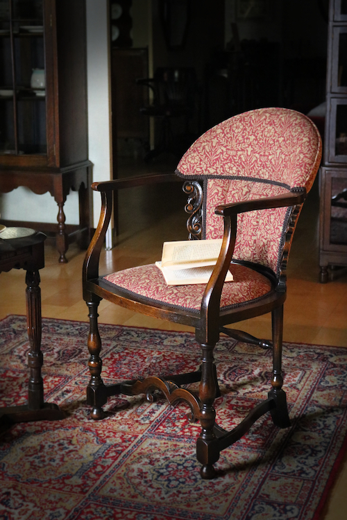 パティーナ(古艶)のあらわれた挽物が美しいデスクチェアーは、絵になる佇まいで印象的な空間に仕上がります。アカンサスやロカイユの彫刻は、繊細なベルフラワーの柄にも馴染み相乗的な美しさを演出。座り心地を追求し背表には5個の小さなクッションを取り付け、唯一無二のチェアーが誕生しました。