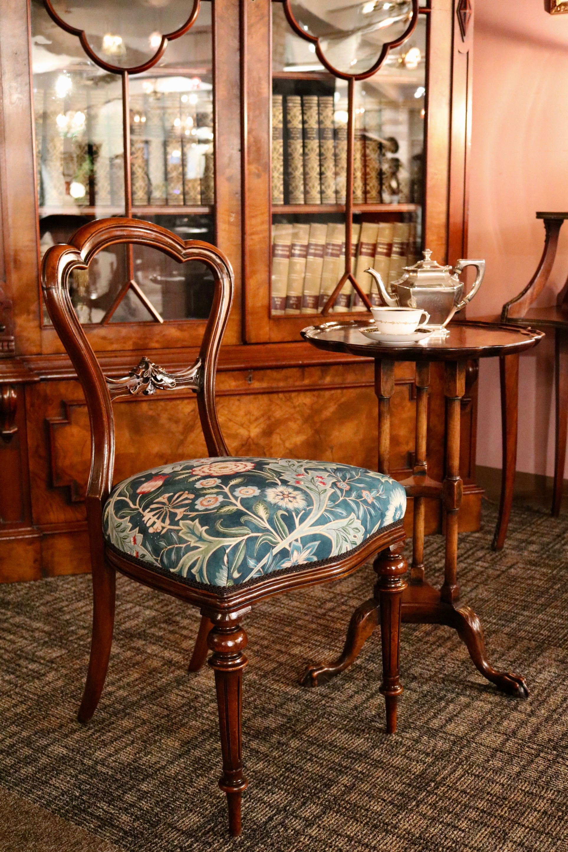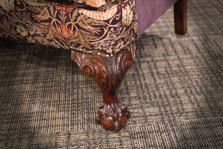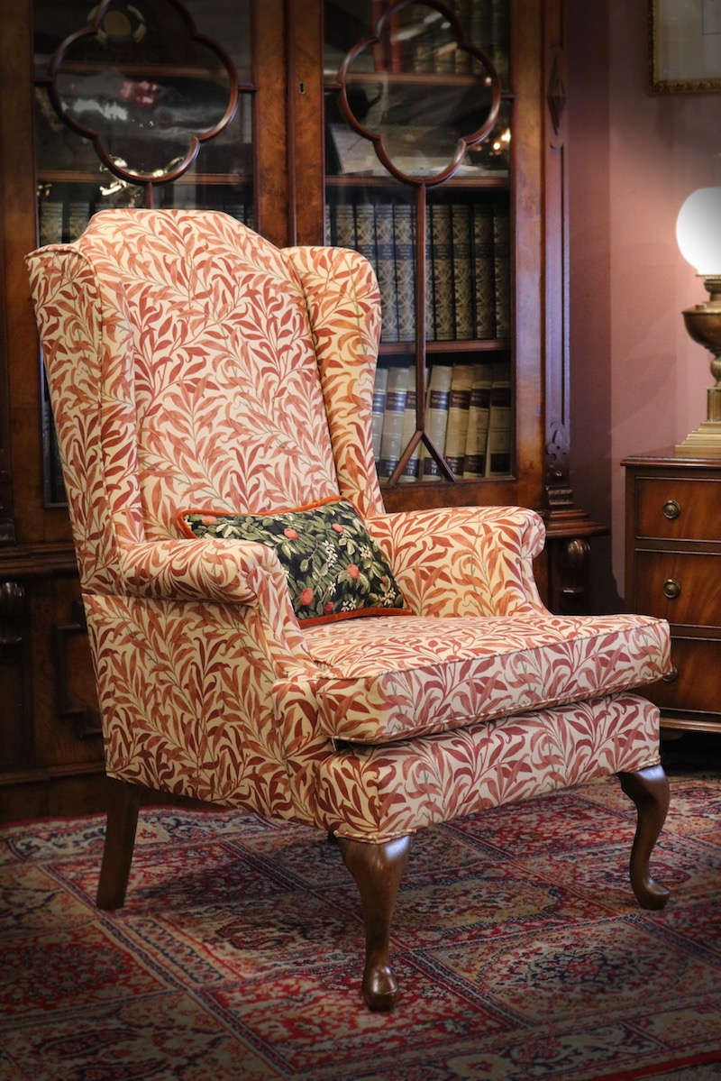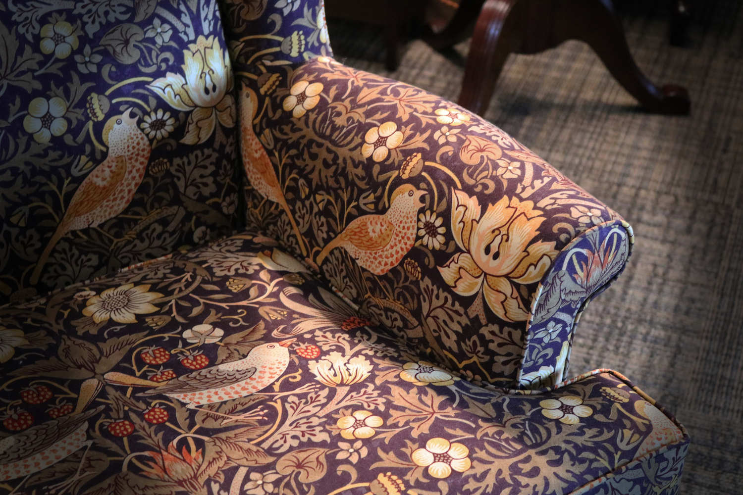 正にモリスの生きた時代である、ヴィクトリアンのバルーンバックチェアーに用いました。長い時を超えて今尚美しいチェアーは、優雅な三つ山の背もたれにアカンサスなど繊細な植物の彫刻が施されています。爽やかなブルー地に華やかな草花が咲き誇る座面。100年以上の時を経てWilhelminaとの組み合わせにロマンを感じます。