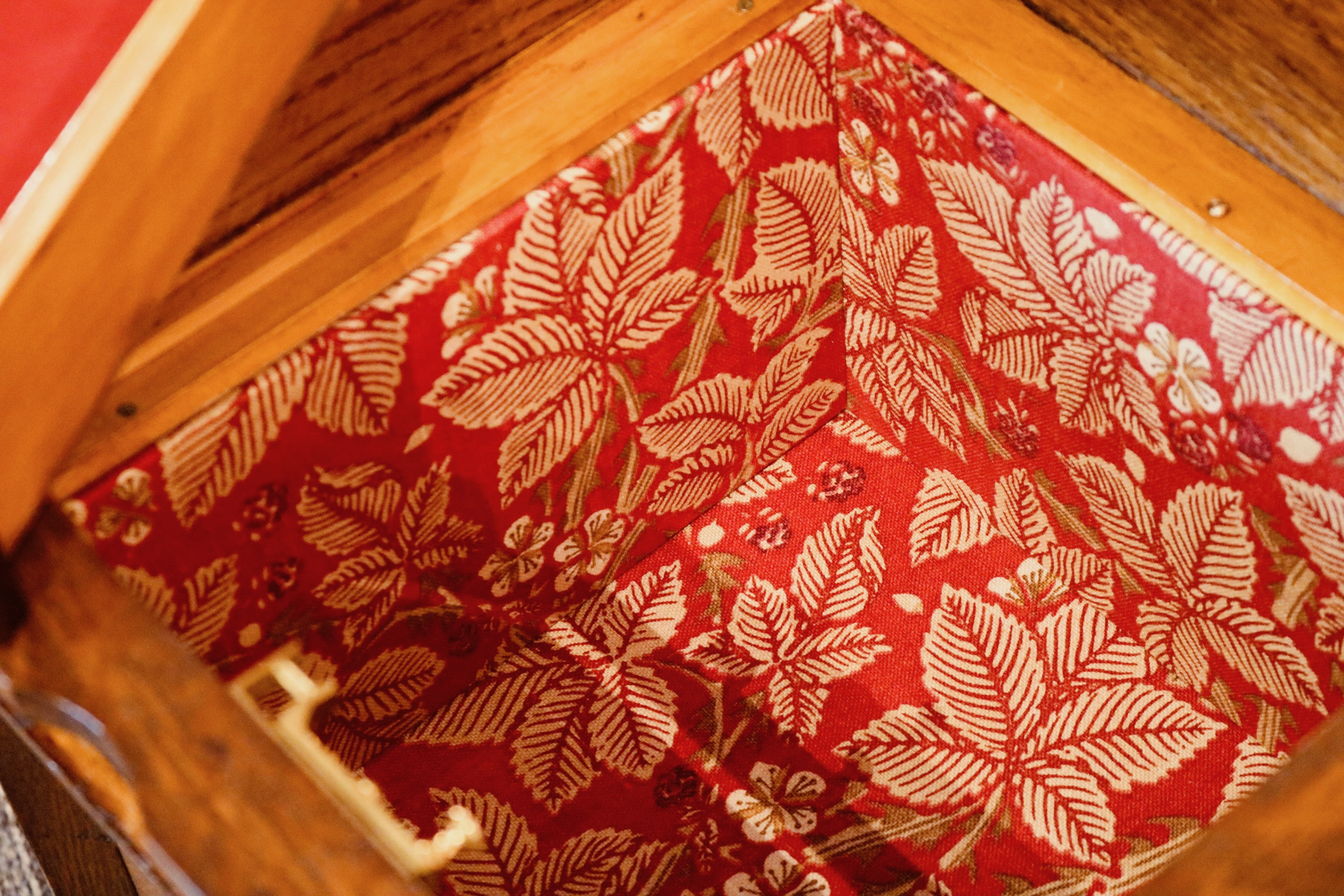 天板を開くと中にたくさんの道具類をしまうことが出来るソーイングボックス 。使っていて楽しくなるように内部を華やかで可愛らしいBrambleの赤い生地で張りました。オークの素朴で優しい風合いにもマッチしています。