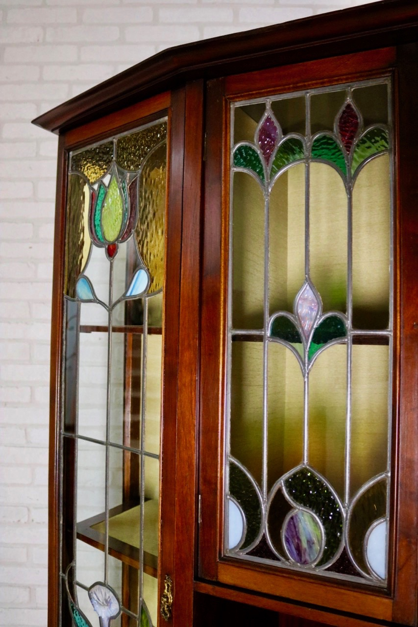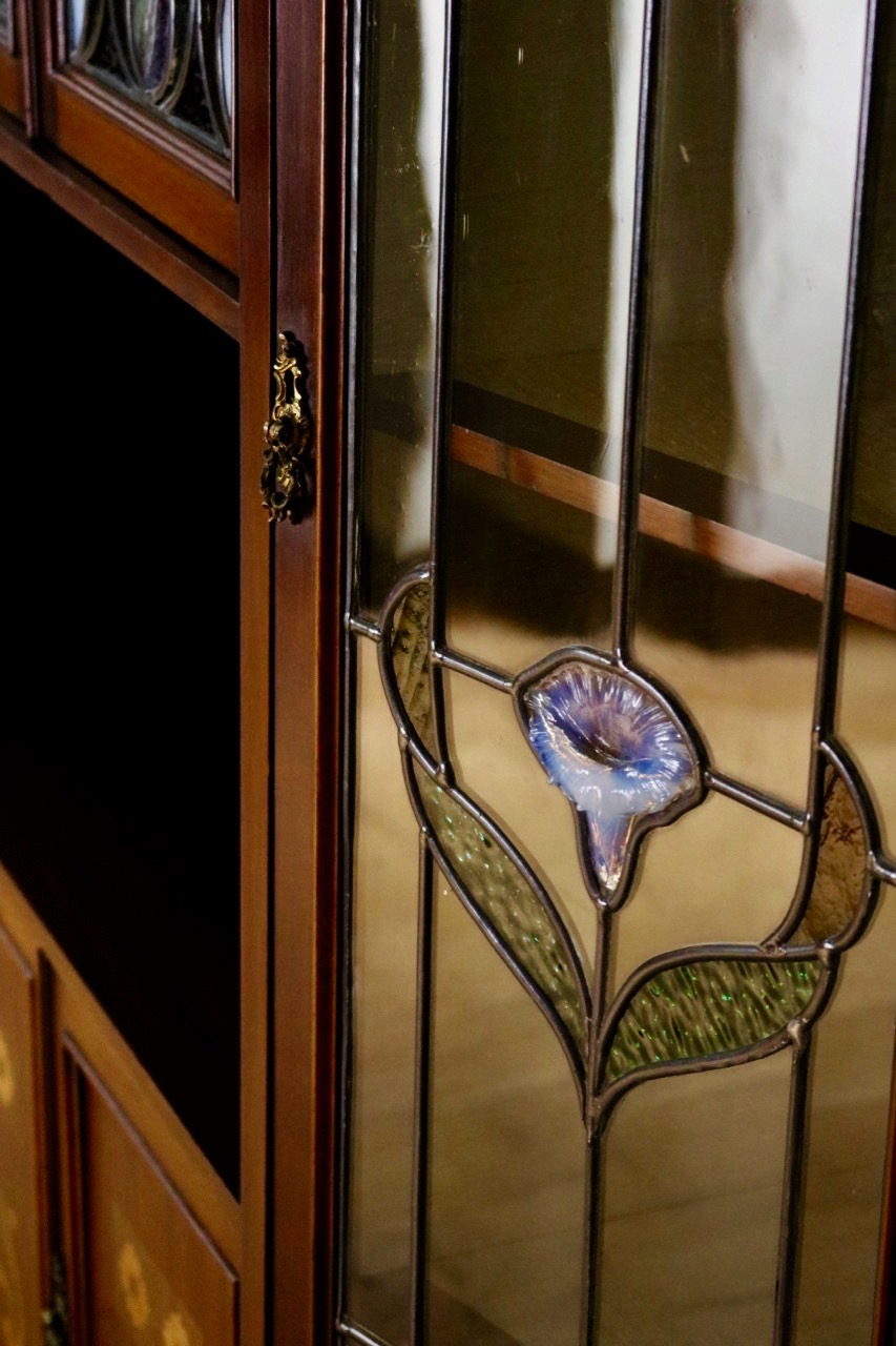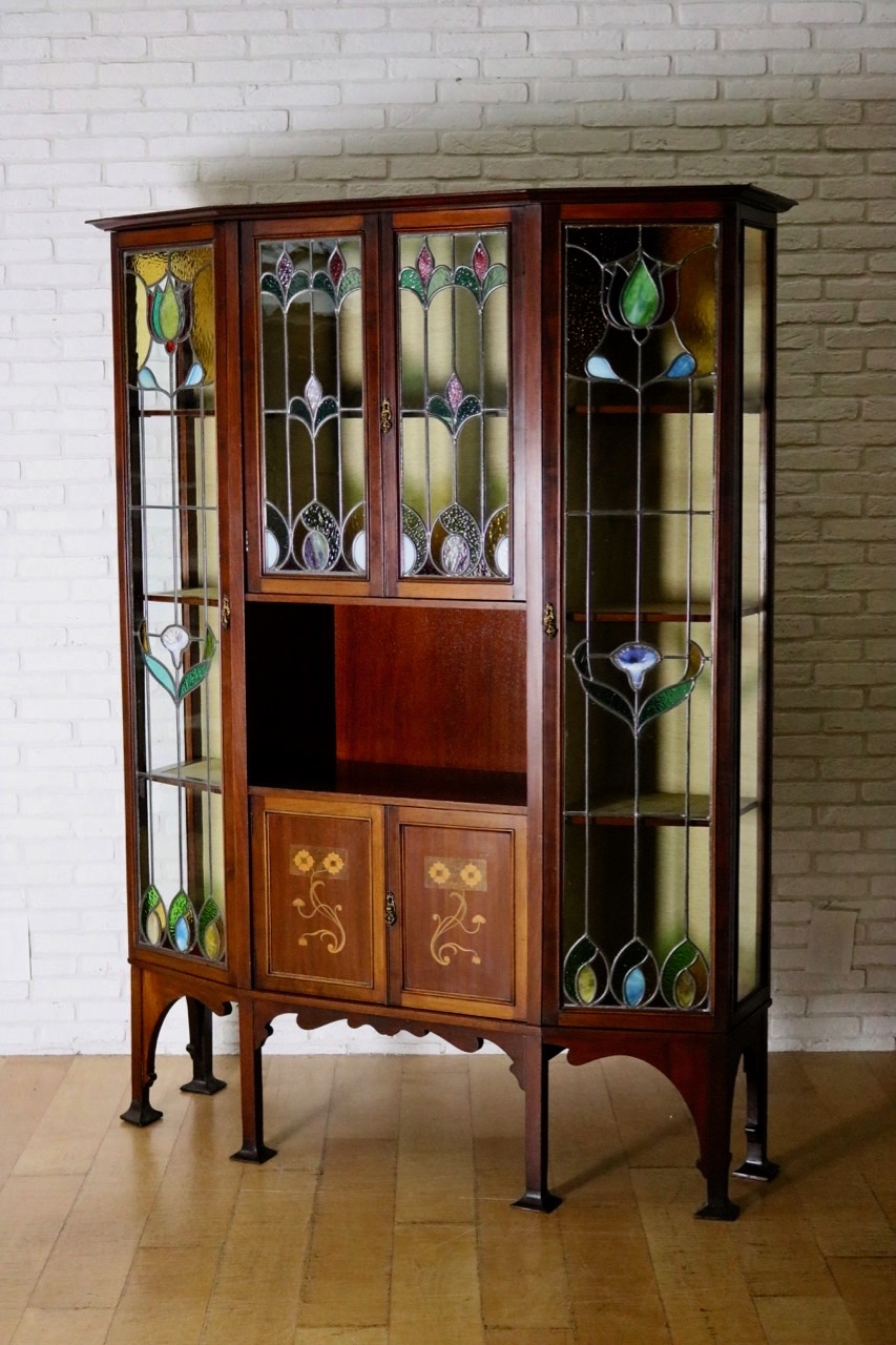 こちらのキャビネットは、鮮やかなステンドグラスが美しいアーツ・アンド・クラフツの逸品 。リーディットに色とりどりのフラワーモチーフが施された非常に手が込んだ職人技に圧倒されます。アンティークならではのガラスのゆらめき、マーブルの色合いが際立ち、直線ラインをベースに幾何学的な装飾とインレイの植物モチーフが融合した美しいキャビネットです。