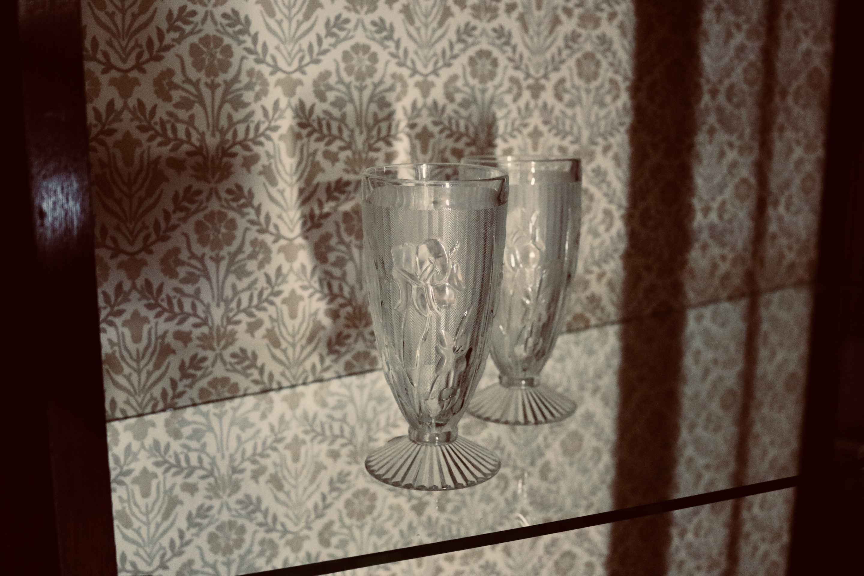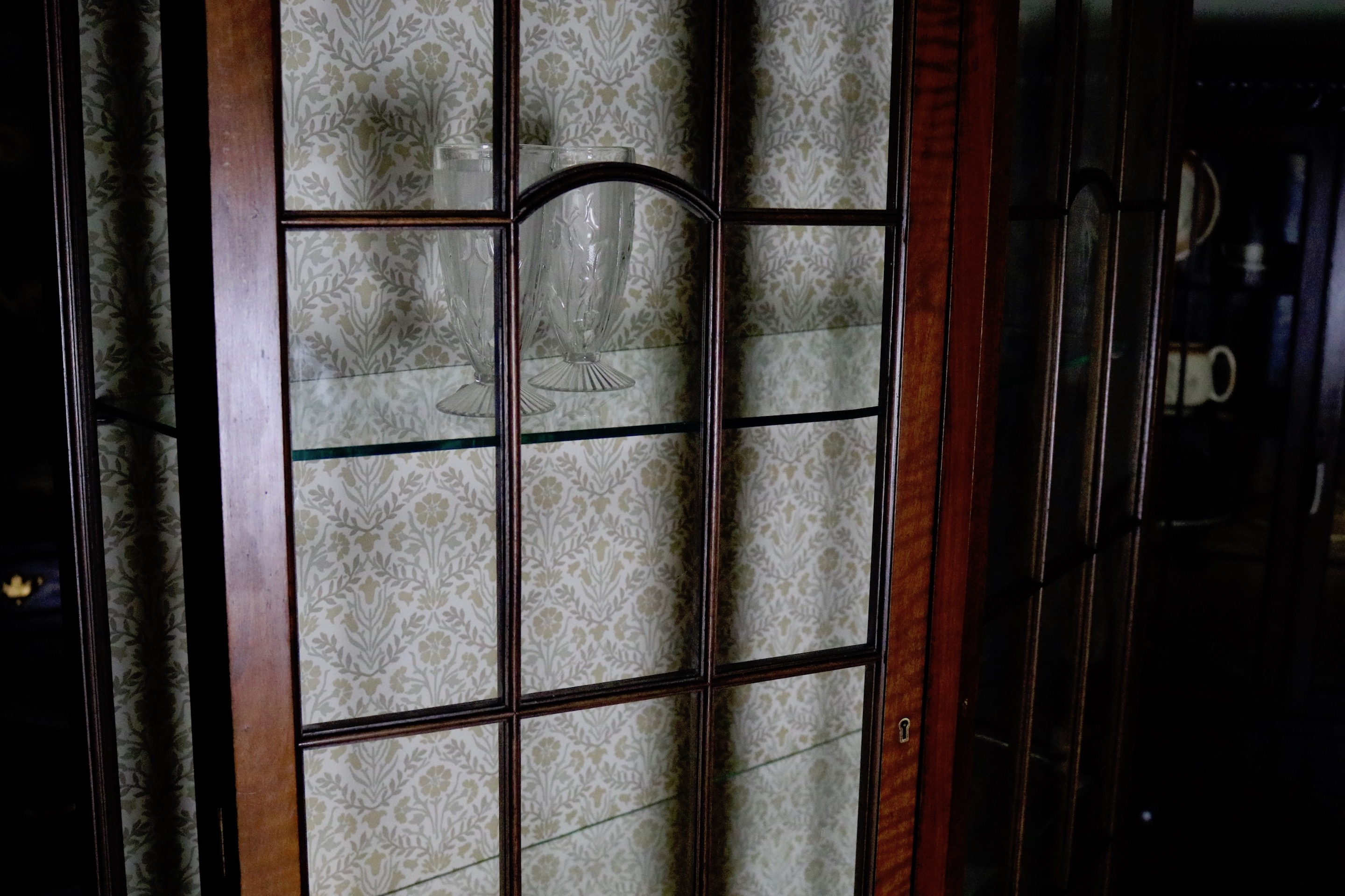 モリスデザインのウォールペーパーを用いたグラスキャビネットや
