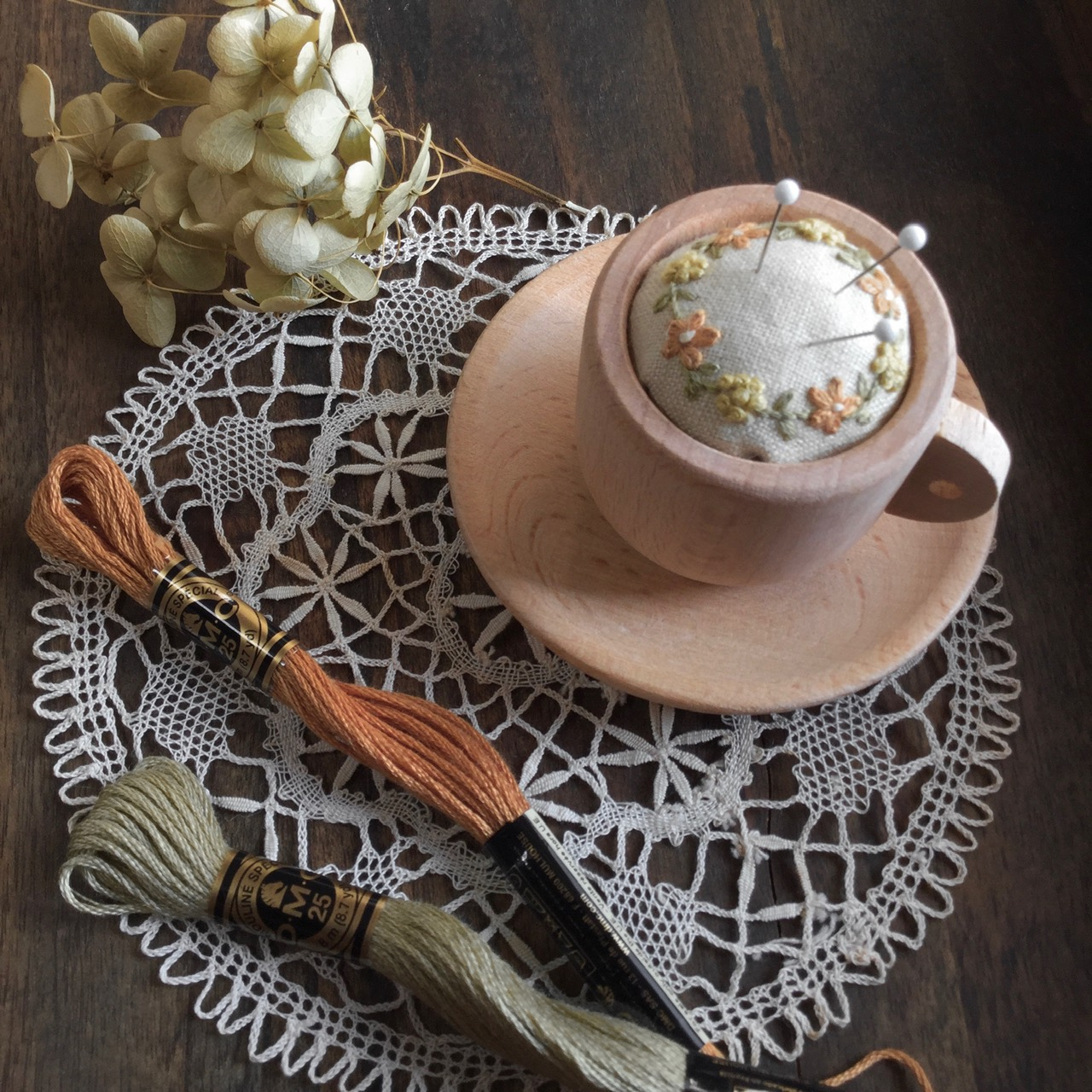 お花を浮かべたお茶のようなティーカップのピンクッション、お茶会で身につけたいブローチ、