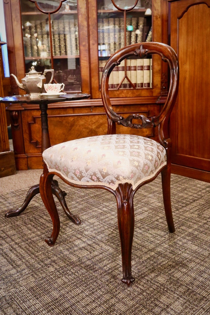 風船のように膨らんだ背もたれが特徴的なバルーンバックチェアーは1830年台半ばから60年代に流行した優美なデザイン。他にもハートや盾形の背もたれ、ピアスドカービングやハイレリーフの手が込んだ彫刻、繊細なインレイが施されたものなどアンティークには美しいチェアーが豊富です。
