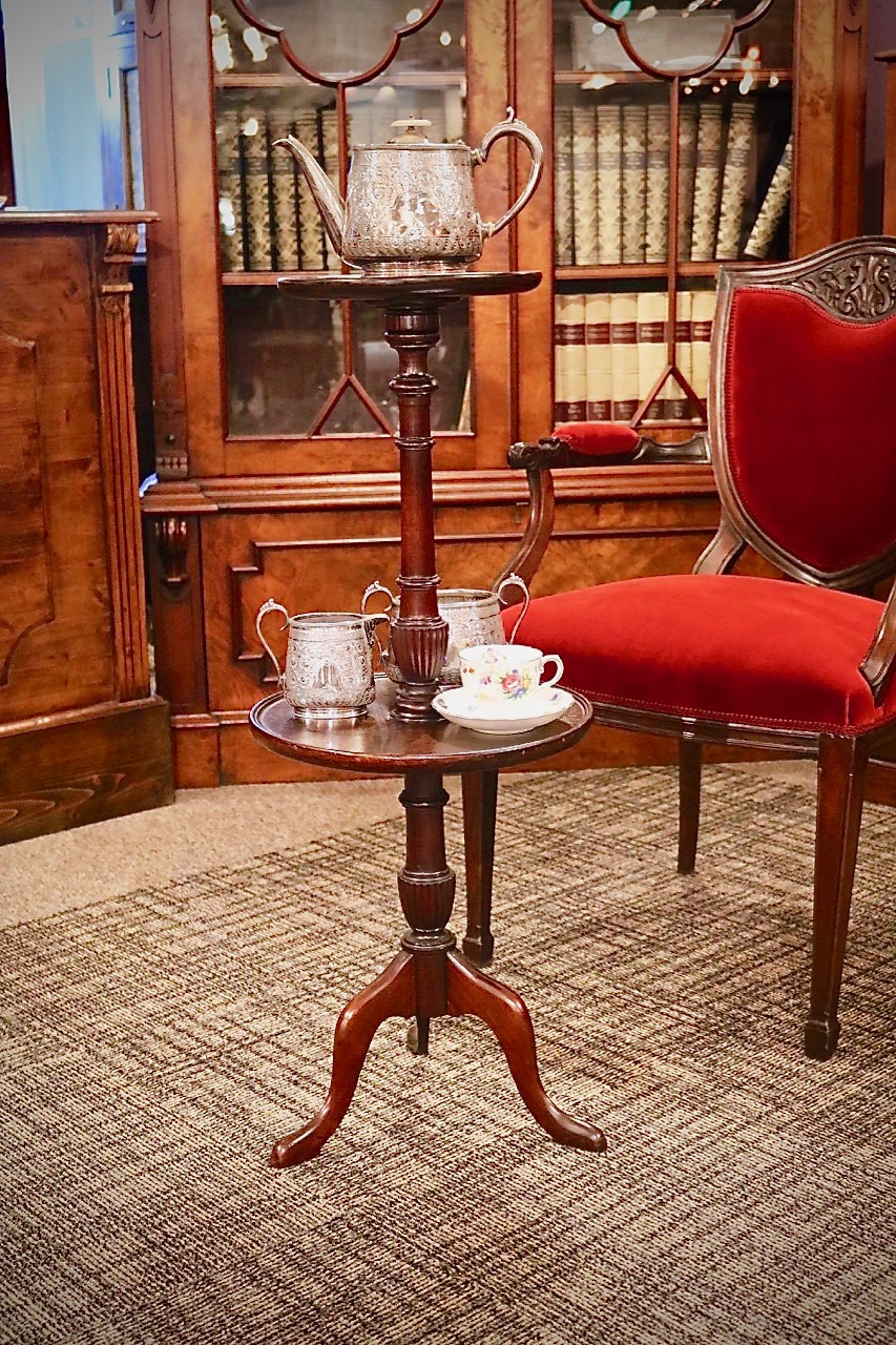 19世紀に入りアフタヌーンティーが広まると、茶道具やお菓子などを置く小型の家具が作られ、上流階級ではダムウェイターテーブルのセッティングが流行します。各段のテーブルに必要なものを置いてゲストへのサーブもスムーズ。又、室内に使用人が待機する必要がなく秘密の会話も楽しめる為、重宝された様です。まさに”もの言わぬ給仕人”という名の通りの家具。