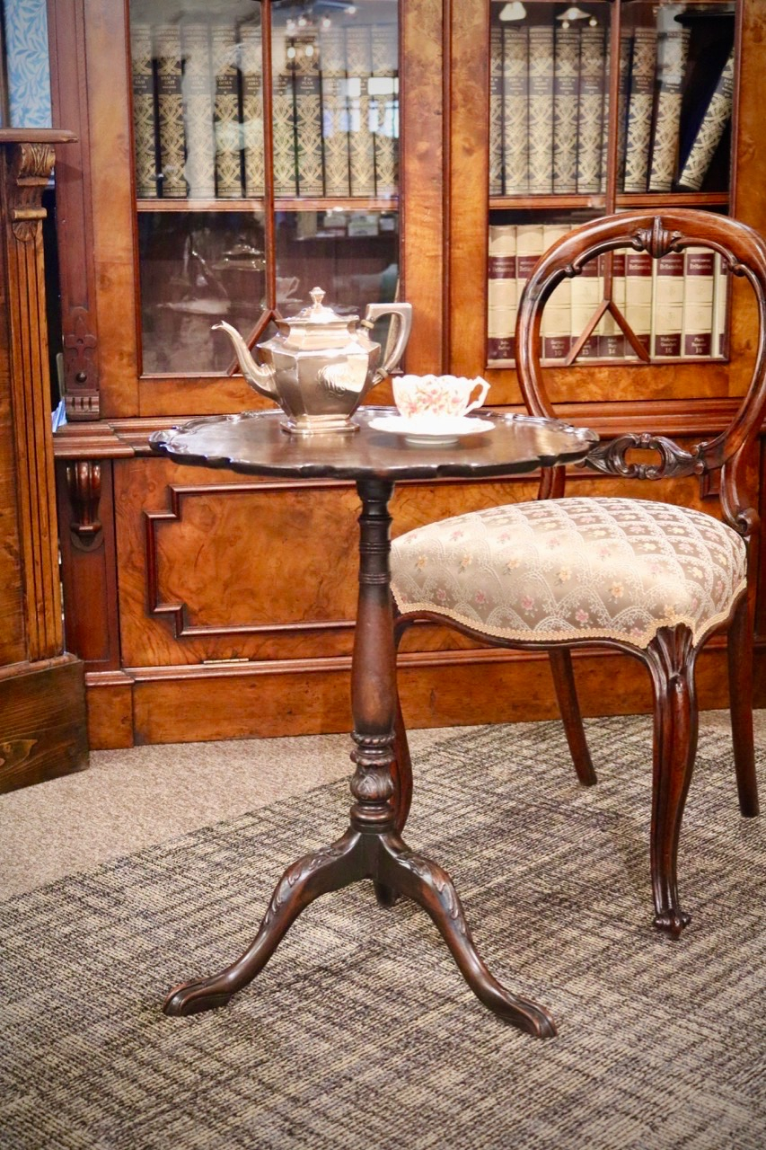 アフタヌーンティーをより洗練されたものにするティーテーブルはデザインが凝ったものなどバリエーションも豊かです。インレイや彫刻が施されたもの、カブリオールレッグ やボール&クロウの脚元、パイクラストの天板縁など素敵なポイントはアンティークならではの魅力です。