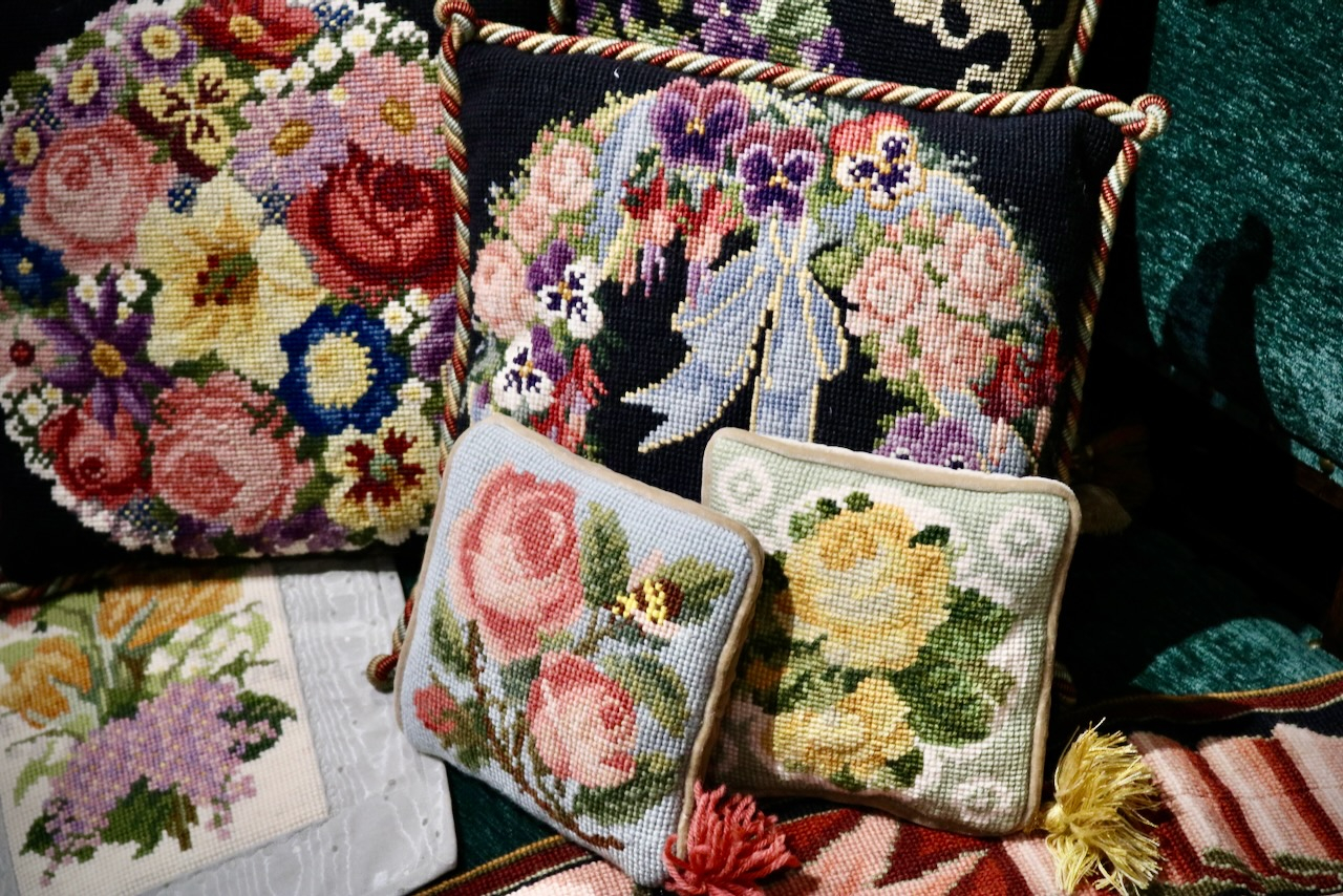 時を超えて愛されるジェオグラフィカのアンティーク家具に囲まれた空間で、繊細なニードルワークの世界をご覧いただけます。