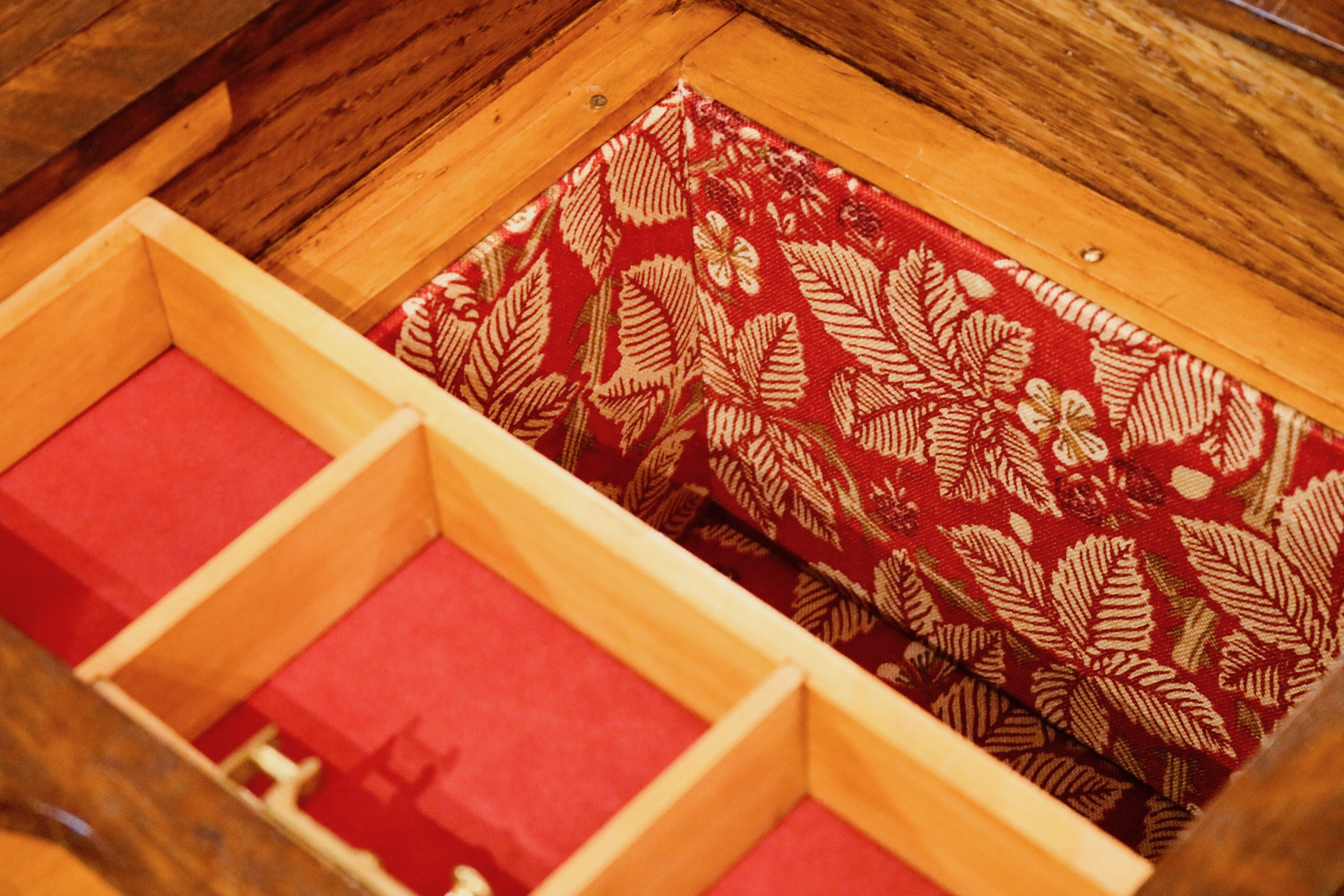 天板を開くと中にたくさんの道具類をしまうことが出来るソーイングボックス 。使っていて楽しくなるように内部を華やかで可愛らしいBrambleの赤い生地で張りました。オークの素朴で優しい風合いにもマッチしています。