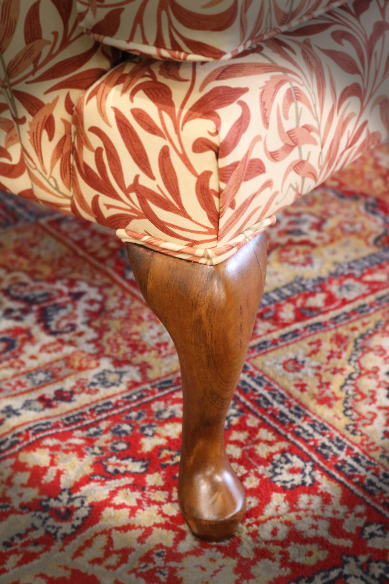 ハイバックの二人掛けソファは、お部屋で一際目を引く存在感を放ちます。広めの表面に愛らしい小鳥たちを描いた人気の柄が際立つ様、外側両サイドと背面はベースが同系色の紫の無地生地で張りました。クラシックなスタイルのフォルムに包まれ、お気に入りの柄と共に居心地の良い時間を過ごしてみてはいかがでしょうか。脚元のアカンサスの彫刻はファブリックの草花の柄にも馴染み、ウォールナット の上質な風合いも魅力的です。