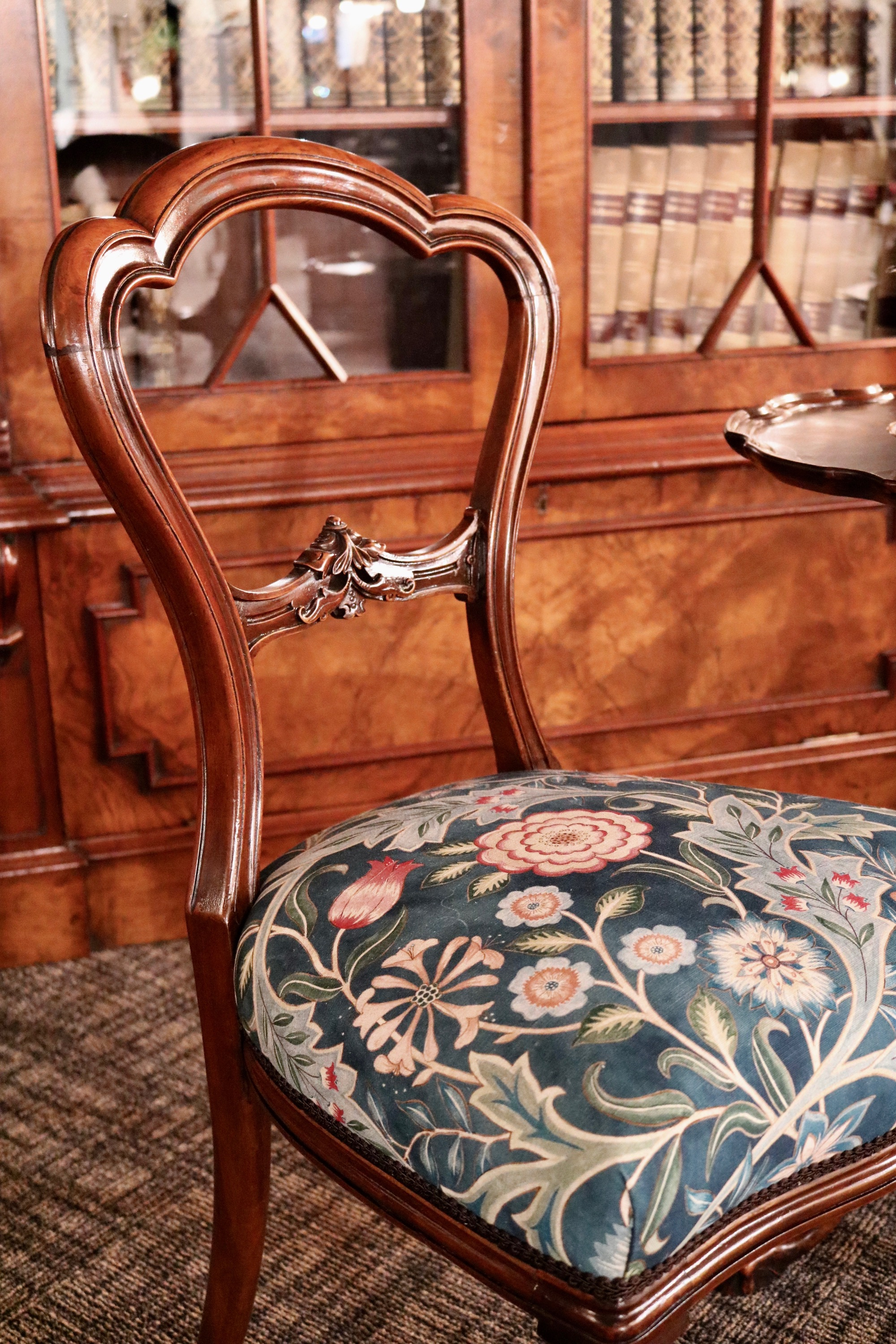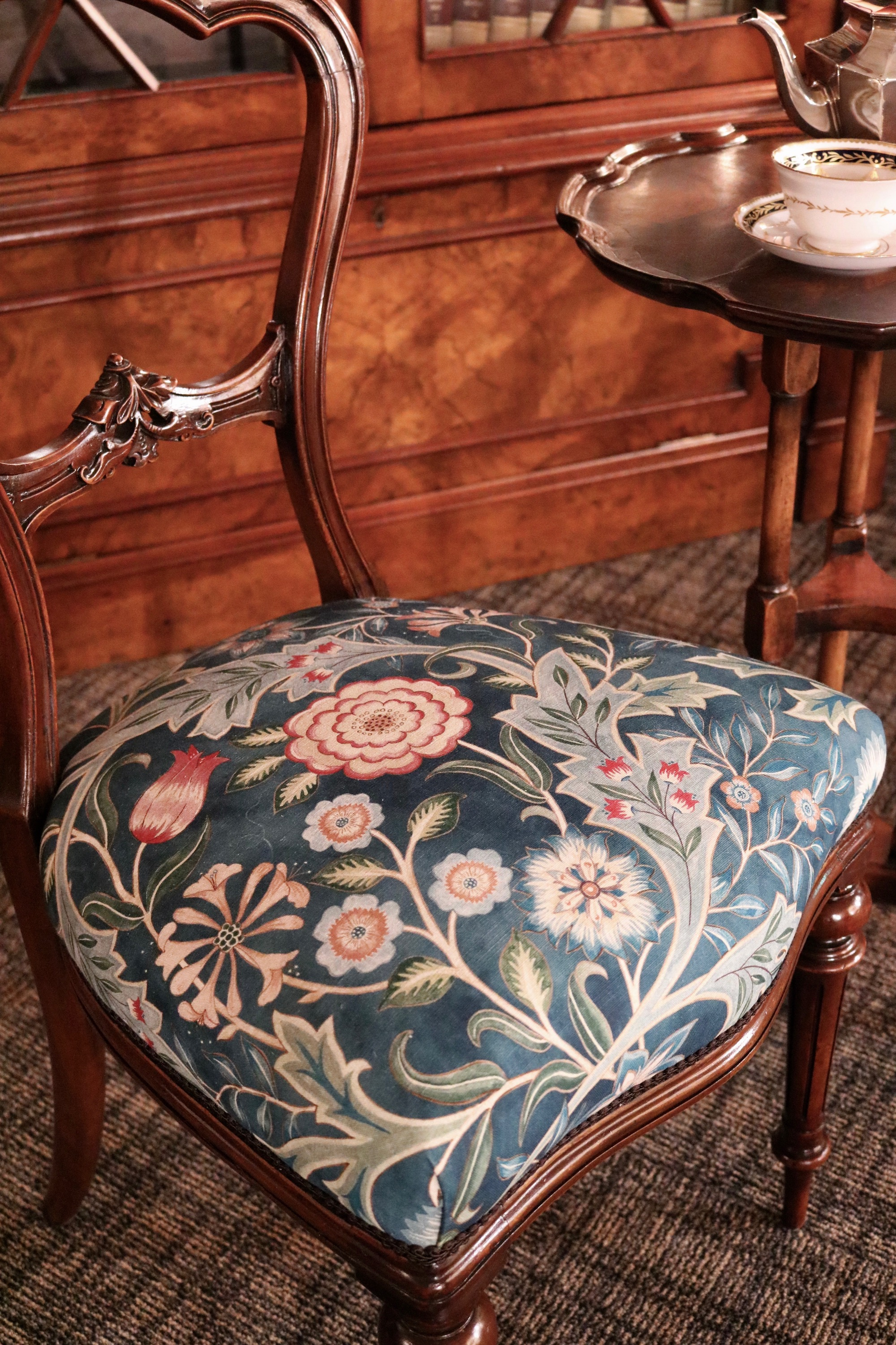 正にモリスの生きた時代である、ヴィクトリアンのバルーンバックチェアーに用いました。長い時を超えて今尚美しいチェアーは、優雅な三つ山の背もたれにアカンサスなど繊細な植物の彫刻が施されています。爽やかなブルー地に華やかな草花が咲き誇る座面。100年以上の時を経てWilhelminaとの組み合わせにロマンを感じます。