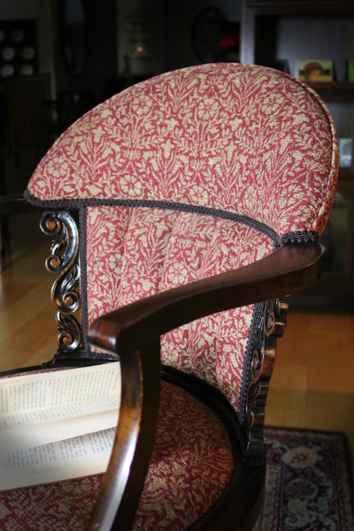 パティーナ(古艶)のあらわれた挽物が美しいデスクチェアーは、絵になる佇まいで印象的な空間に仕上がります。アカンサスやロカイユの彫刻は、繊細なベルフラワーの柄にも馴染み相乗的な美しさを演出。座り心地を追求し背表には5個の小さなクッションを取り付け、唯一無二のチェアーが誕生しました。