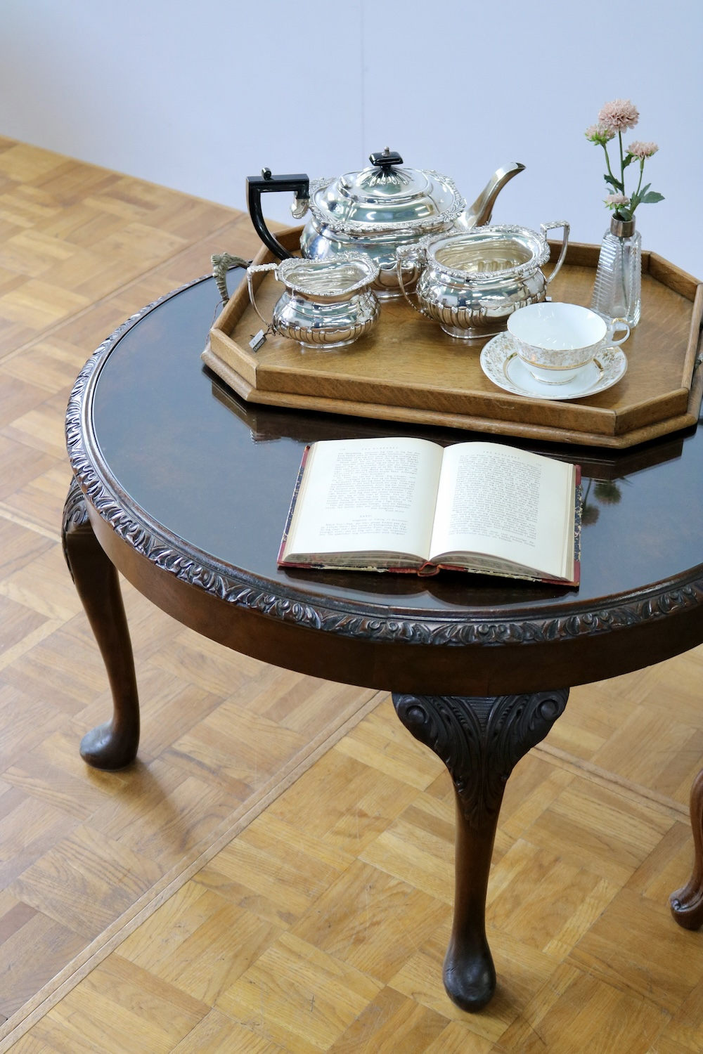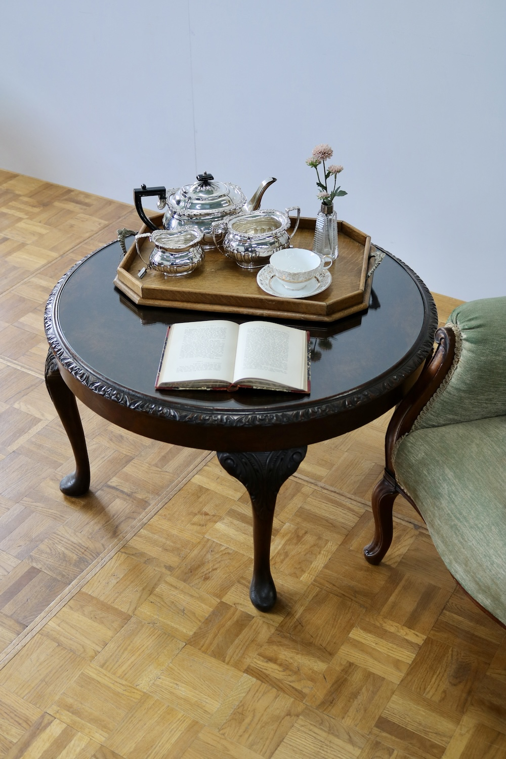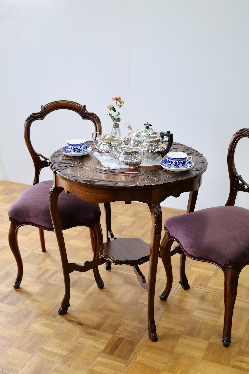 ティータイムをより豊かに演出するティーテーブルにエレガントなバルーンバックチェアーを併せてクラシカルな空間に。