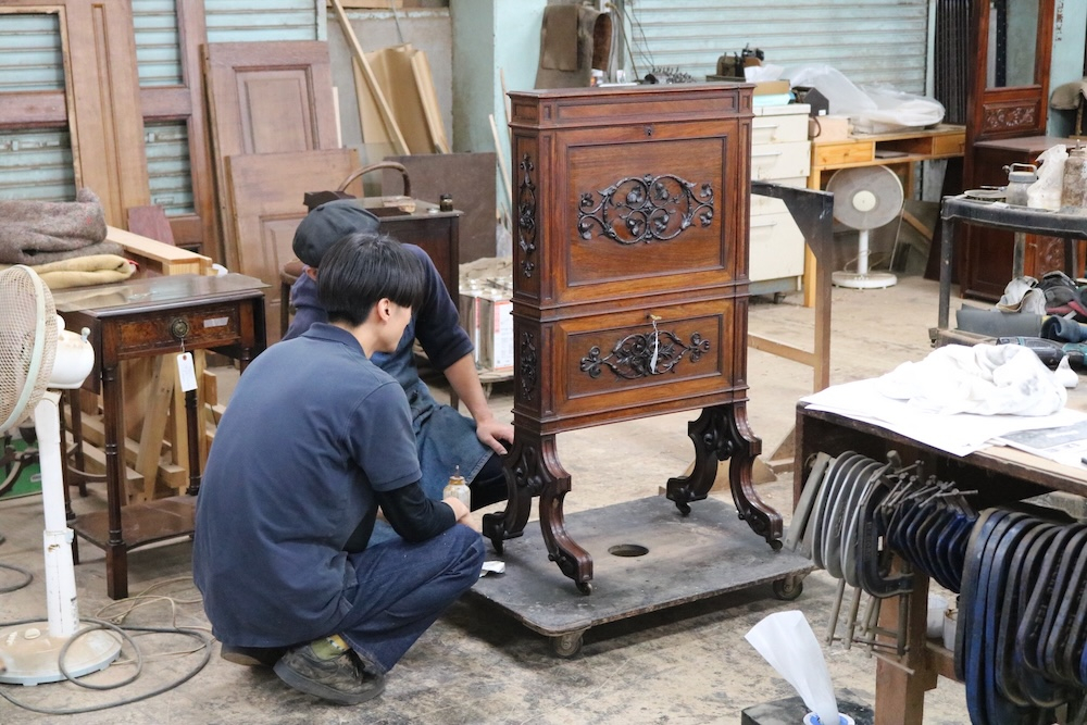 港北ファクトリーでは熟練の修復士の手によって一つ一つ丁寧に修復したアンティーク家具を販売しています。
