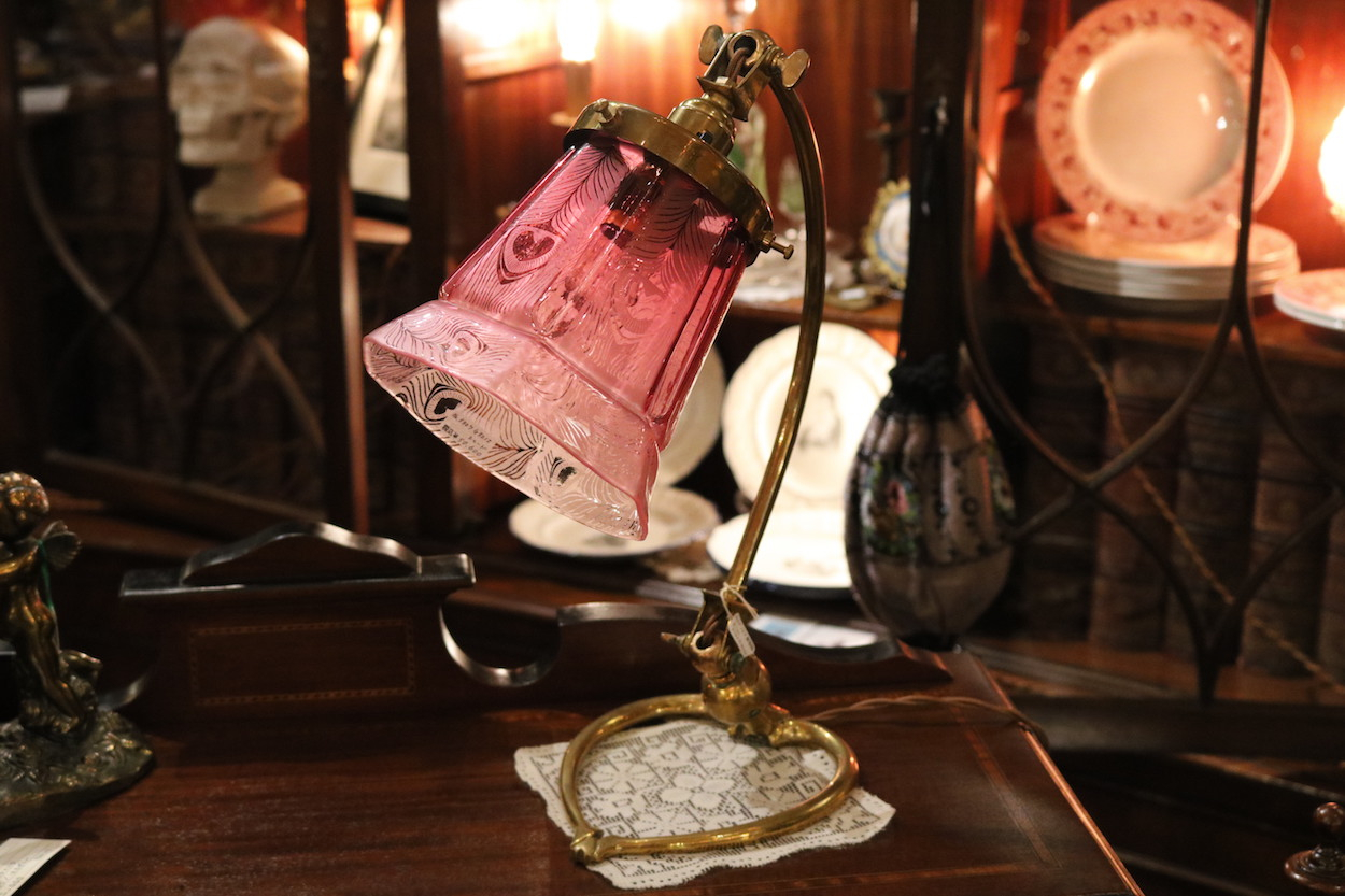 アンティークのテーブルランプも入荷いたしました。こちらはユニークでレアなハート型のベース。ガラスシェードにもハートのモチーフが描かれています。